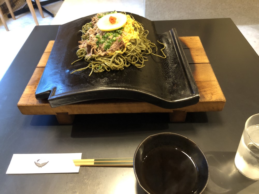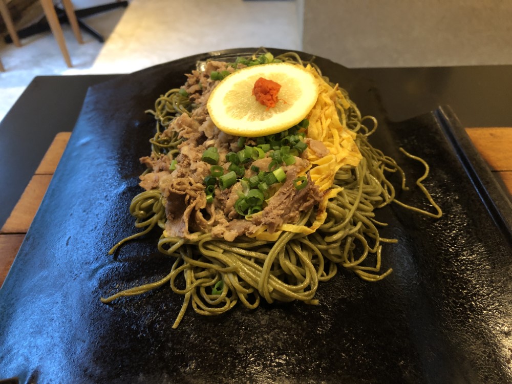瓦そばは、熱した瓦に盛った茶そばに錦糸卵、
