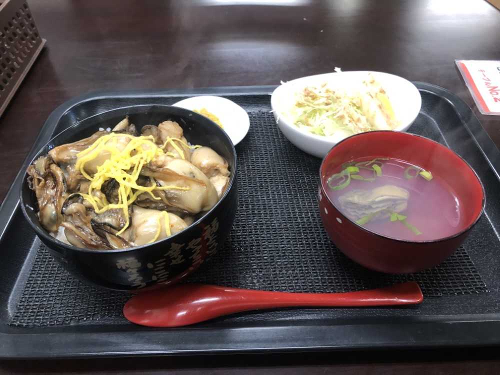 牡蠣丼と牡蠣汁とサラダに漬物が付いてます。
