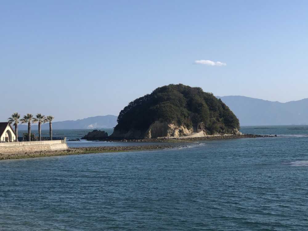 海の先にぽっかり浮かぶ手影島は、潮がひくと、