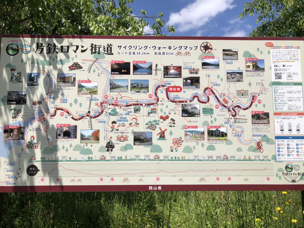 柵原ふれあい鉱山公園まで続く距離約34kmの