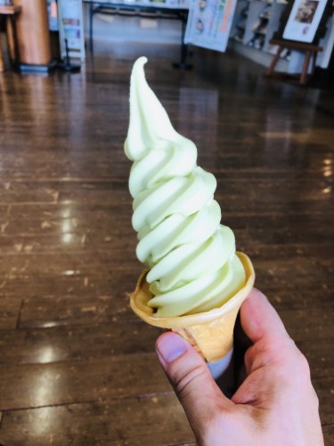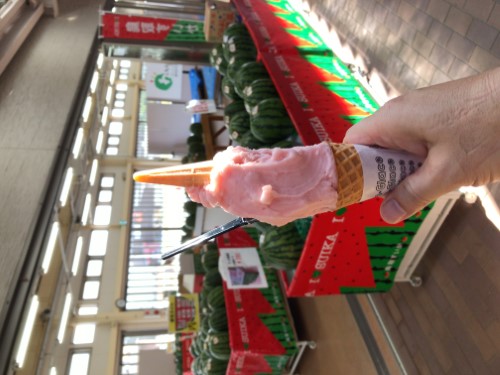 梨ソフトで一息。今日も暑くなりそうだ。