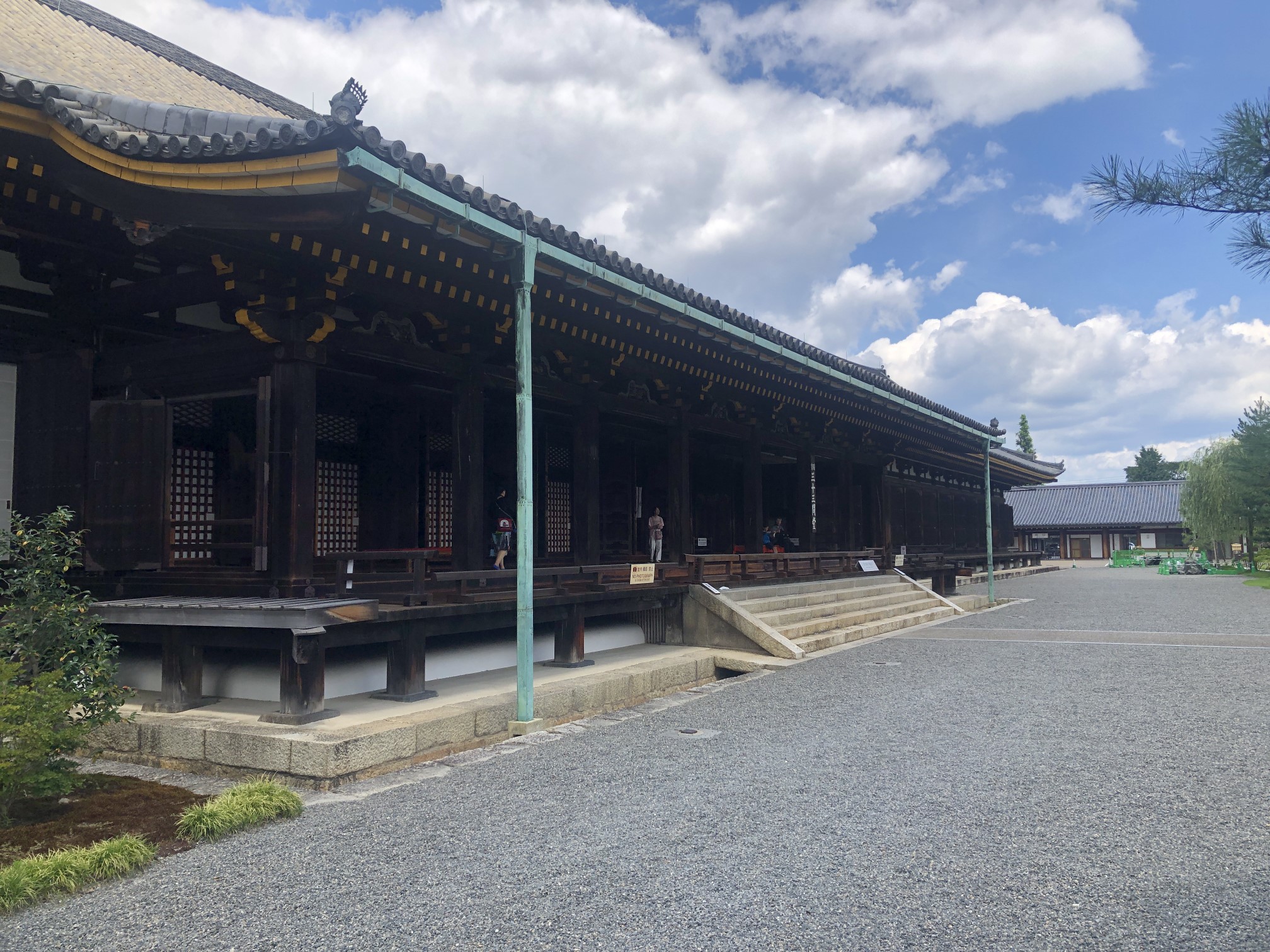 本堂を正面外側から見ると、柱の間数は三十五あります。