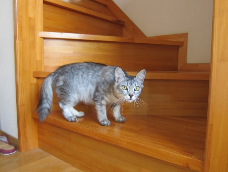 今の時期、新緑がきれいですね鮮やかな色できれいだったので、うちの柿の木の葉っぱをイチにプレゼント(笑)あ、立っちゃいましたwどうやら食べ物だと思ってますね~…(*´艸`*)食べるんじゃなくてこうしたかったんですよ不満そうな顔してますwふてくされたいっちゃん^^;今日は服も緑であってるぞお外で猫さんを撮ってみたり。臆病なので、うちの周りだけ~(=´∇`=)新しい場所では、尻尾が下がりまくりであまり歩かないんですw海へ下りる階段上で、なにかを見ています。見ている先には…ニャンコ!近所の人が魚をさばいて、いらないところを海に捨てたみたいなので集まってました