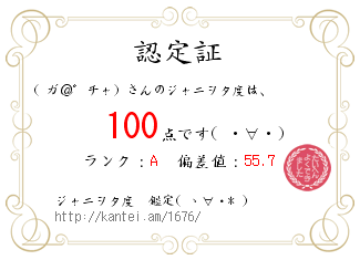 どっかのHPにあったからやってみたよね~(ガ@゜チャ)まぢにキモチワルイ笑"(ガ@゜チャ)さんのジャニヲタ度は、 100 点です(・∀・) ランク:A 偏差値:55.7 順位:1位 (24357人中) おお~(・∀・)貴方のジャニヲタ度はすごいですね!これからもジャニーズを一緒に愛しましょ? (ガ@゜チャ)さんのラッキ→アイテム:うちわ 【 認 定 証 】これ・めちあ簡単だったよ?小池徹平はジャニーズ?みたいな事が最初の質問だったよb誰れも分かるとおもいますけど?笑それにしてもあたしキモチワルイナ-