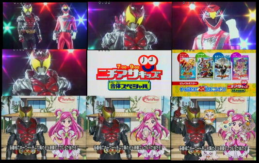 以前「スーパーヒーロータイム」と言う名称で戦隊とライダー枠を合わせて呼ばれていた時期が合ったが今週は「ニチアサキッズ合体スペシャル」らしい。7時からの恐竜キングは見ていないので微妙だが、プリキュアも遂にヒーロー枠進出か!(たぶん違う・・子供向け枠だろう。。。)それはそうと今週は各番組のオープニング映像に合同の映像が含まれており、キバ&ゴーオンレッドなどカッコイイのだが・・・「キバ&リーダー」は無しだろう。。。背景はナッツハウスだし、シロップとミルクにタカられている等ある意味罰ゲームに近い。昨日買ったキン肉マン2世の単行本のせいでマイケルの正体が気になりすぎて眠れない。(プレイボーイ見ていないので、単行本で初めて読みました。)まだ現状がロビン・キッド組の試合中らしく、ウォーズマン組の試合はその次。もうすぐ連載では正体が明かされそうな感じなのだが・・。ファーストインプレッションでは「マンモスマン」。野生・氷(氷河期)から連想するとどうしても、但し王位編の超人が出るのは微妙なので予想で多いクリオネマンなら以前セイウチンを倒しているので少し納得できるが、コイツパートナーでウォーズマンがネプチューンマンから勝ちを狙っているとは思えないのだが・・。