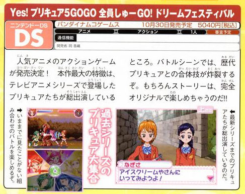 明日発売のファミ通と言えば「デビルサマナー 葛葉ライドウ対アバドン王」で話題は持ちきりのはずだったのだが、まさかの作品が掲載されるらしい・・・しかもライドウの翌週。。マジですか!テレビシリーズで登場したプリキュア達が総出演・・ぶっちゃけ「5」からしか見ていない自分は微妙な所、歴代のプリキュアを入れる容量があったら敵役を多く収録して欲しい(画面写真を見る限り、スコルプさんが3人にボコられているので・・ベースは5GOGOか?)バトルシーンでは歴代のプリキュアとの合体技が炸裂するぞ!・・この説明文の「との」の部分が微妙な予感満載。メインキャラ5+1(戦隊+ローズ)と必殺技用演出(KOFで言う所のストライカー的ポジション:無印+ルミナス+SS)な臭いがするのですが・・・。格闘ではなくアクションだが昨年に比べればかなりユーザーの声を聞いてくれたと思う。(アレはあれで2週目までガッツリ遊ばしてもらいましたが・・)買うのは当然だが、歴代プリキュアと書かれているので「満と薫(SS)」は参戦無しか?(5からしか見ていない自分が満と薫を気にするなと言うツッコミは無しでお願いします。。)・・スプラッシュスター見た方が良いのだろうか・・、最後の2話は何気に見たけどドラゴンボール並みに戦っているプリキュア+満・薫がいたので主人公は4人だと思っていたらプリキュアは2人だった罠。