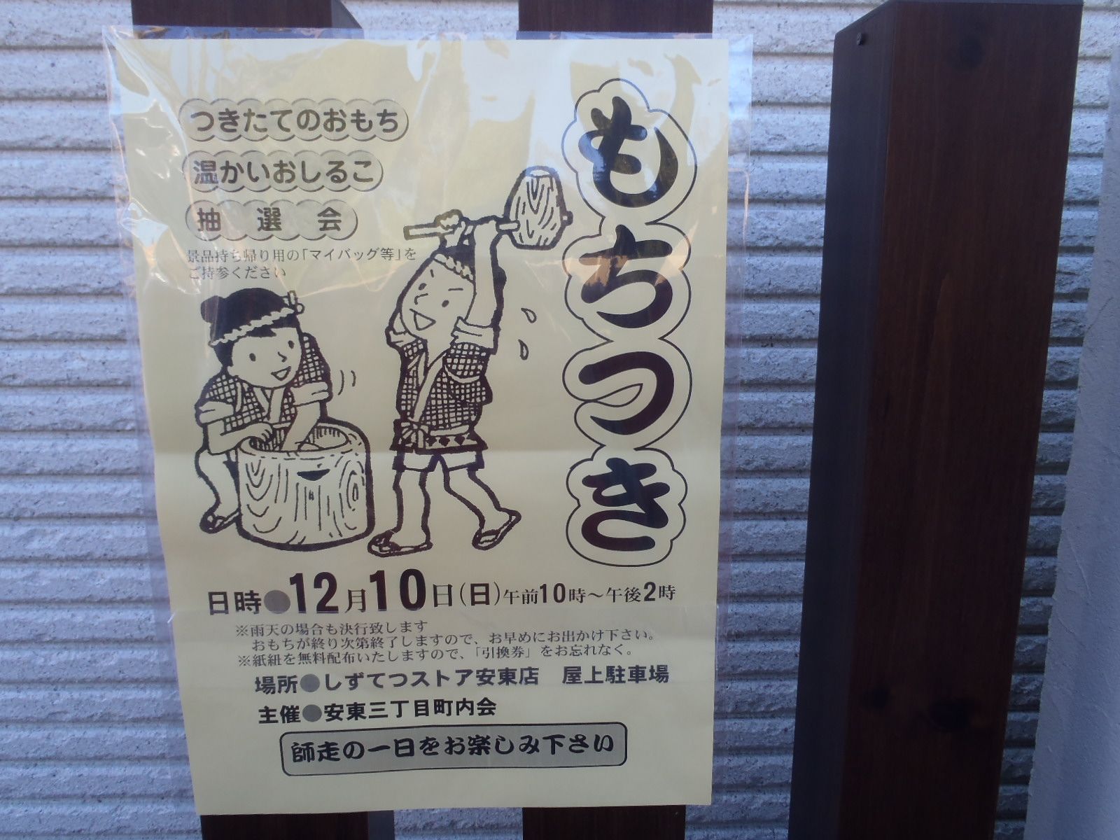 今日は、毎年恒例の町内のもちつき大会。私も役員のはしくれとしてお手伝いです。静鉄ストア安東店の屋上駐車場で朝早くから準備におおわらわです。天気も良くて多くの方が来てくれました。!子供たちも楽しそうですね~後ろに見える竜爪山も今日はくっきり見えます。係りの皆さんもおつかれさまでした!