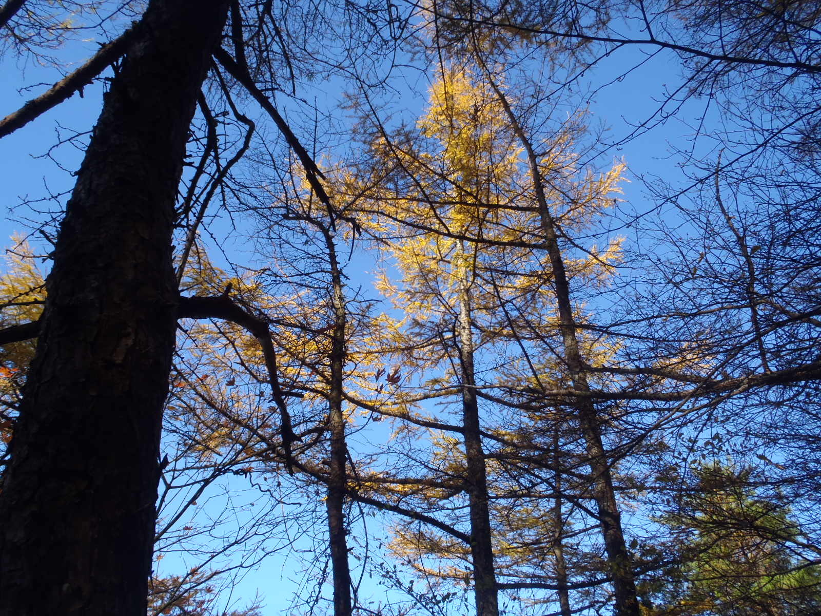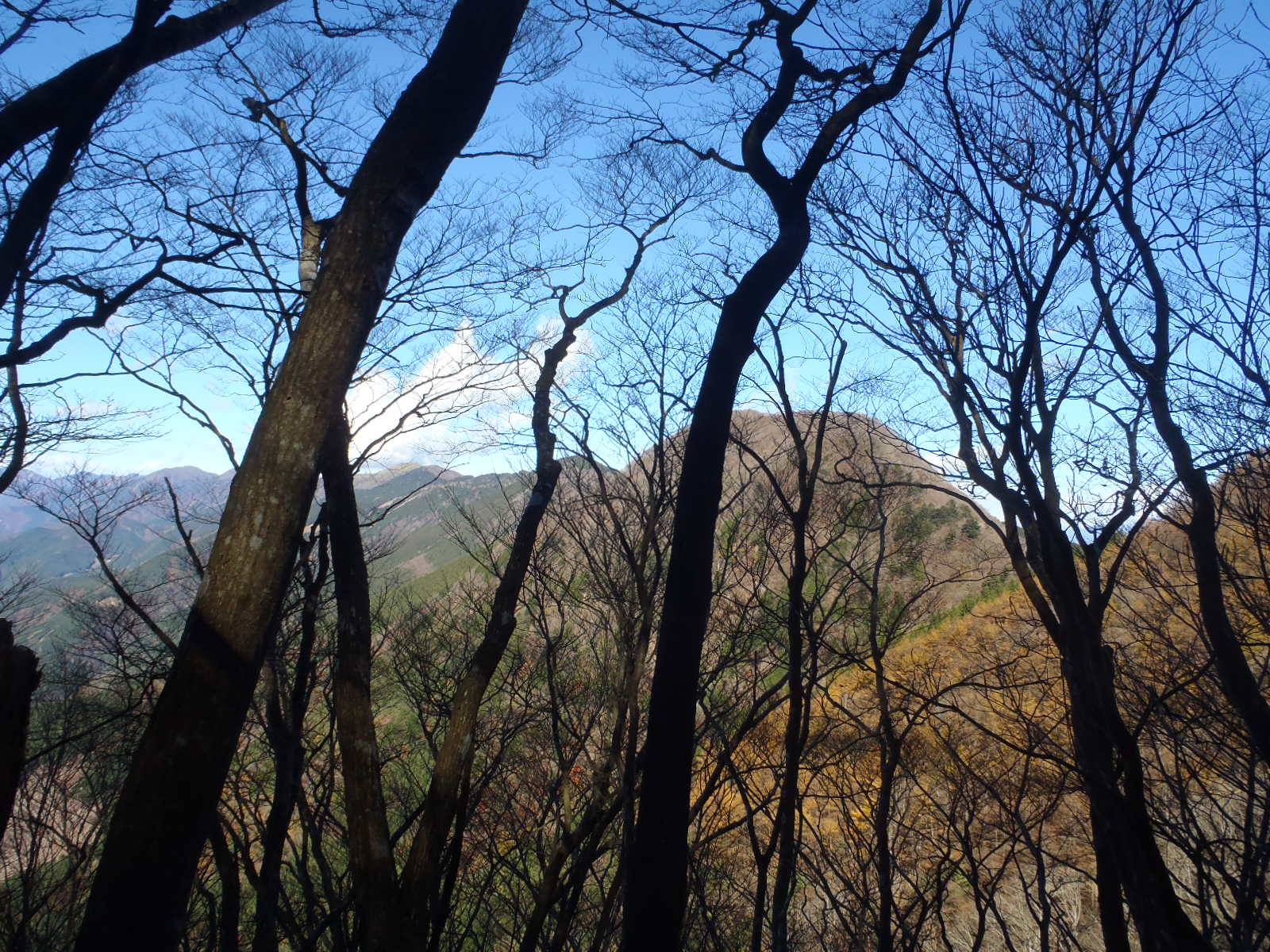 真富士山はこの夏の盛りに、第三登山口から歩き始めて30分でへばりダウン、やむなく引き返した苦い思い出がある。まだ若かったころと言っても数年前までは、MTBを担ぎ竜爪まで縦走したり、浅間原まで行って送電線巡視路を安倍川まで走り下ったり、歩きでは何度となく登ったけど途中で戻ったのは初めてのこと!。ああ~これで自分の山歩きももう終わりかと思った時もありしばらく遠ざかっていた真富士山。しかし、今日は気分一新!気持ちを入れ替えて入山した。平野第三登山口を9時55分に出発。オイ平から真富士神社にお参りして山頂へ今はカラマツの黄葉が美しい!樹幹越しに大無間山や奥の南アルプスもすでに冬化粧であった。11時20分、前回ほどの苦労はなかったが何とか第一真富士山(1343m)山頂へ。絶好の日和、180度の展望が広がり何とも言えず気持ちがよい!!誰もいない山頂でしばしボケーとまどろむ~まだ少しは、やれるかな?と、、、、秀峰富士山が今日はやけに神々しく見えたもんだ!11時30分山頂を後に第二真富士山へ向かう。稜線の自然林はすでに落葉、明るい木立の小道を散策~楽しい!真富士峠からじきに始まる岩場には新しいロープが張られていた。パトロールの皆さんいつもながらお疲れ様です。12時20分。第二真富士山(1401m)着。残念ながら第一真富士山ほどの眺望は拝めない。軽い昼食後、少し北上して私の好きな西尾根を下る。正面に見える緑の頂は湯野岳だ。 この西尾根もよくMTBで下ったものだがもう今では山頂まで担ぎ上げる体力がない!13時50分。あまり明瞭でない山道?をマーキングを頼りに今日は黒ん沢の源流部に降り立つ。右岸に沿ってまだ紅葉の残る山道を快適に歩く。13時50分。黒沢橋のたもとに出る。安倍川をはさんで西山稜を眺めながら林道歩きをしたあと14時25分に出発した第三登山口に戻った。