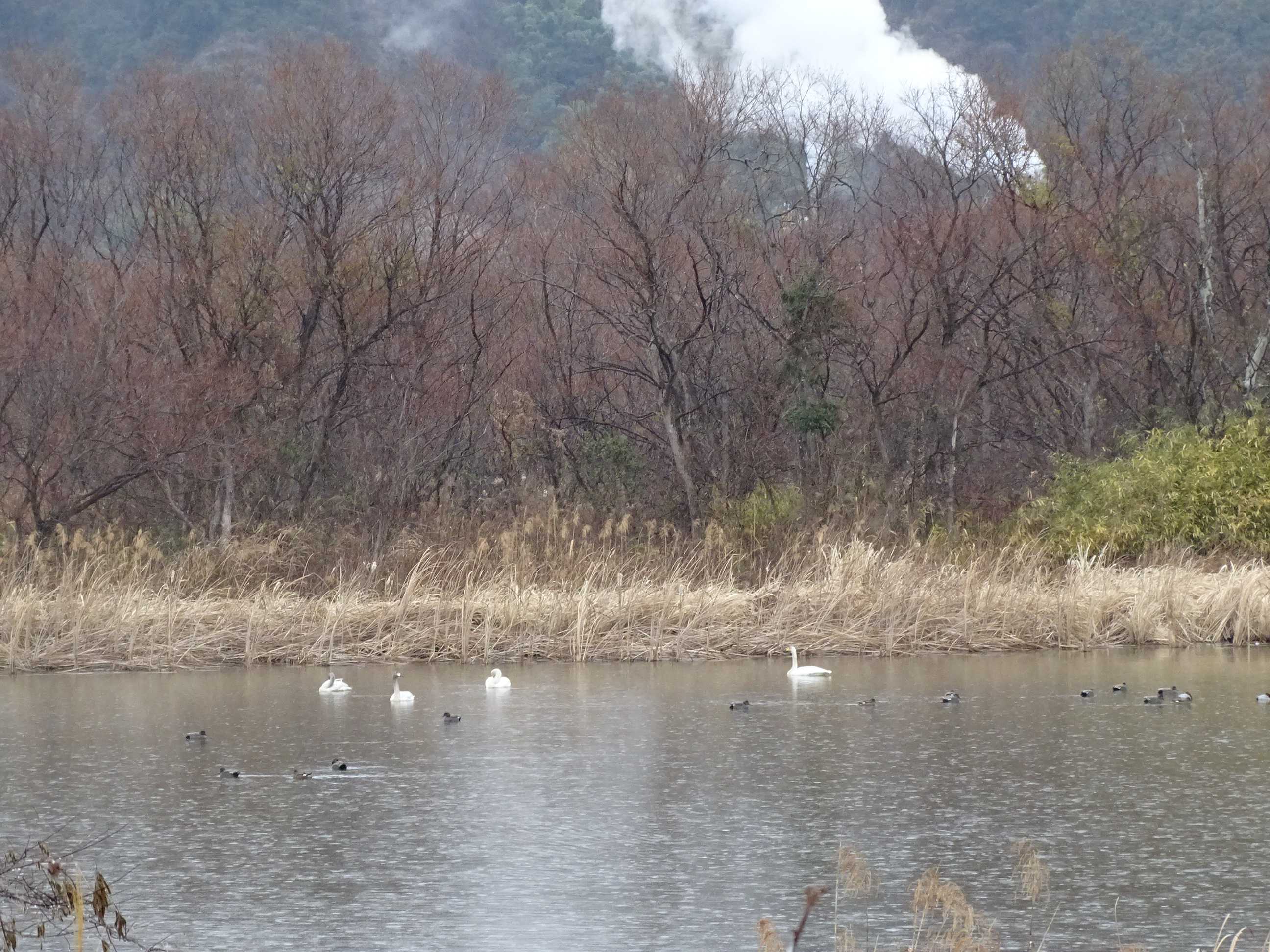 朝からみぞれ交じりの冷たい雨が降り出した~温暖な静岡市街でみぞれや雪が降るのはたいへん稀なことだ。場所によっては雪に変わったところもあったらしい。年末から年始にかけては好天が続いたので、生き物にとっては恵みの雨でもあるのだろうが?クルマが示す外気温は3℃。昼近いのにこの低温!寒いわけである!通院の帰りに、麻機遊水池の第三工区へ飛来しているその後のオオハクチョウが気になって寄り道をした。期待通り、池には、雨の中をマガモ、コガモ、ヒドリガモやオオバンなどに混じって遊泳中の4羽のオオハクチョウ!優雅に湖面を滑るように泳いでいた~アシの林から出たり入ったり~成鳥2羽、若鳥2羽の構成も変わっていない~これから本格的な寒さがやって来るのでもうしばらくは滞在する予定なのだろう~そっと見守っていきたいものだ~
