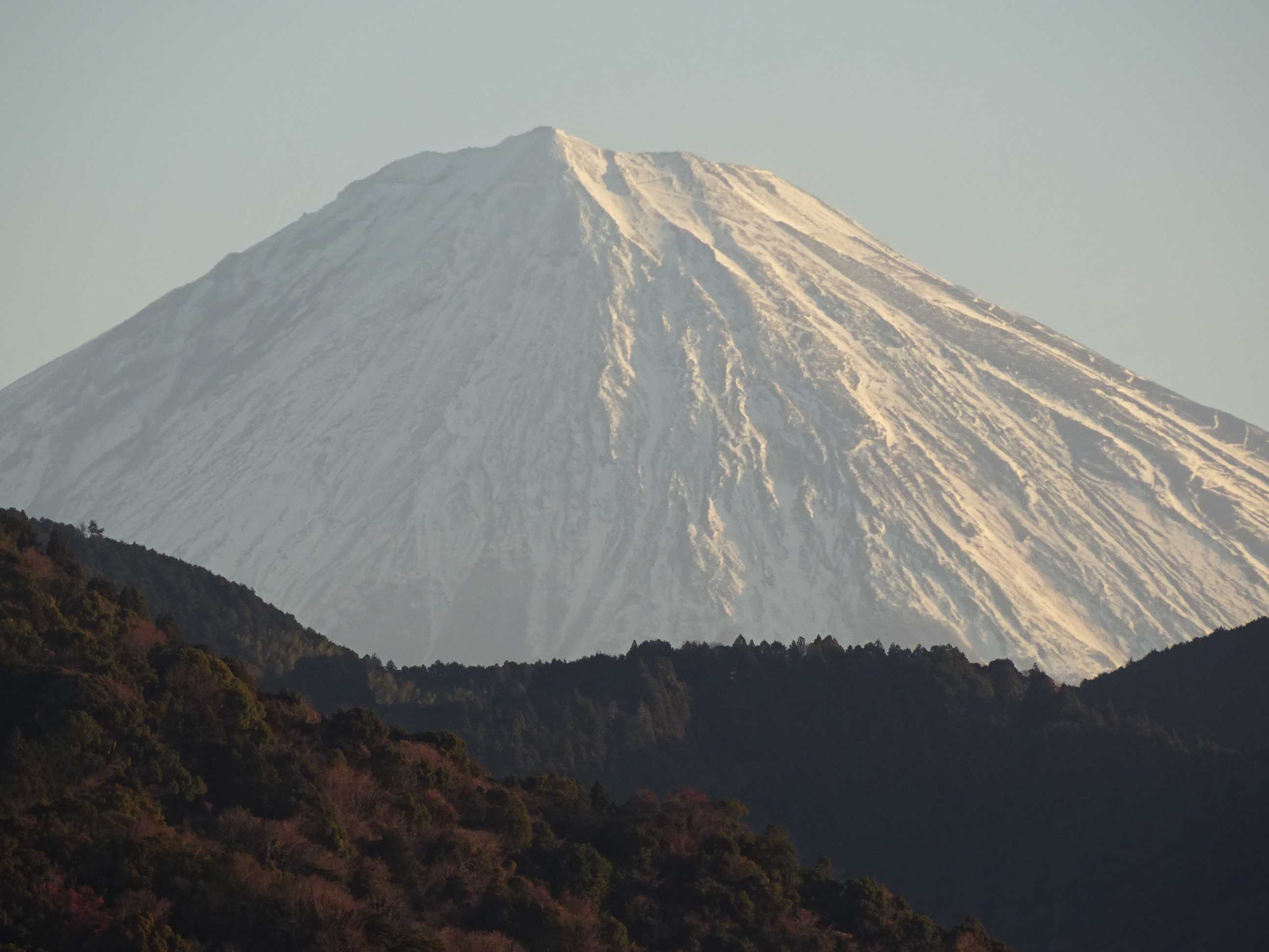 1月12日(水)の静岡新聞・朝刊に、俵峰から真富士山へ向かう登山道の脇にある「大滝」が氷瀑になって「自然の芸術品」として掲載されていた。この機を見逃すわけにはいかないと、ヨガ仲間のK口さんを誘って出かけた!コース予定は、平野第三登山口から第一真富士山に登った後は稜線コースを南下して~山の仔鹿の池~伐採地~一本杉~富士見岳~一本杉~大滝~引落峠~真富士山登山口(俵峰)である。下山口の俵峰にクルマをデポして平野第三登山口からスタート!外気温は-1℃。ヲイ平を過ぎたあたりから降雪の跡あり、予備として軽アイゼンを持ってきたが履くほどでもない。真富士神社に参拝~今は、周囲の樹々が伸びて展望はないが、50年位前には眼下に安倍川や南アルプスが眺めの良い展望所だった!真富士神社から眺める富士山。第一真富士山と第二真富士山の間にうまく収まっている~第一真富士山(1343m)で小休止~ K口さんと証拠写真を1枚~山頂付近に雪煙が上がる富士山!手前の雪のない山は、高ドッキョウ(左)と貫ケ岳(右)か~安倍川上流に目を転ずれば、残念ながら南アルプスは雲の中で見えない~白峰南嶺の布引山(左)と双耳峰の笊ケ岳(右)その手前は、安倍奥の大谷崩(左)と大谷嶺(大谷崩ノ頭)だ~安倍東山稜の全貌。大光山から十枚山~下十枚山~青笹山~浅間原~湯野岳~第二真富士山まで~たっぷり雪化粧した山伏を中心に後方は小河内山、青薙山、稲又山眼下に杉尾山と興津川が見えている~第一真富士山の山頂で東西の景観をたっぷり楽しんで、稜線を南に下る~たいへん美しい冬枯れの雑木林がしばらく続く~葉が生い茂る夏には気がつくことのない稜線直下には小さな池がある。誰が付けたか「山の仔鹿の池」いい名だと思う~厳しい冷え込みでで完全に凍っている。周囲は、明るい草原なので、テント持参で一泊して好きな酒で程よく酔って俗世を忘れ夜空でも眺めたら幸せだろうなと思わせる。窪地にあるので、西風の影響もなく今日は暖かい~安倍川側から肌を射すような冷たい風が吹きまくる伐採地を過ぎ、一本杉の分岐で富士見岳(1078m)に寄り道をする。山頂からの眺めは良い!南方面は、竜爪山、、北方面には、歩いて来た第一真富士山、右の尖った峰は第二真富士山である~山名の如く富士山の眺望は、山頂から真富士山方向へ20mほど下ったところが明るく開けておりそこからバッチリ眺めることができる。!富士見岳から再び一本杉に戻り、大滝を目指す!20分ほどグングン高度を下げて着いた大滝は見事に氷結し、期待通りの氷瀑が現れた!ここは、標高900mの地点。安倍川左岸の支流、八重沢の源頭である。安倍川側から吹く冷たい風が、凍結と解凍を繰り返して氷が大きく成長し幻想的な風景を見せるのだ!高さ20mの大滝も冬場は迫力充分だ!十二分に氷瀑を堪能し、引落峠から俵峰の真富士山登山口に出た~山の会に所属していた20代の頃、仲間で忘年会などをやっていた山小屋は朽ちているもののまだ雰囲気は残していた~50年以上も前のことであるあの頃が懐かしいなあ~デポしておいた俵峰駐車場に戻る。昔は、駐車できる場所が無くて困ったものだが、今は、整備された広い専用の駐車場が有るので助かる。30台くらいは置けるだろう~ざっと、今日の行程を整理してみた~黄色の線は今日、歩いたコースを示している。<参考コースタイム>平野第三登山口8:45~9:40ヲイ平~10:35真富士神社~10:50第一真富士山11:10~12:10山の仔鹿の池(ランチタイム)12:30~12:35伐採地~12:45一本杉~13:00富士見岳13:20~13:30一本杉~13:50大滝14:10~14:40引落峠~15:00真富士山登山口(俵峰)~15:15俵峰・登山者専用駐車場 歩数計→22000歩 2.5万図 和田島