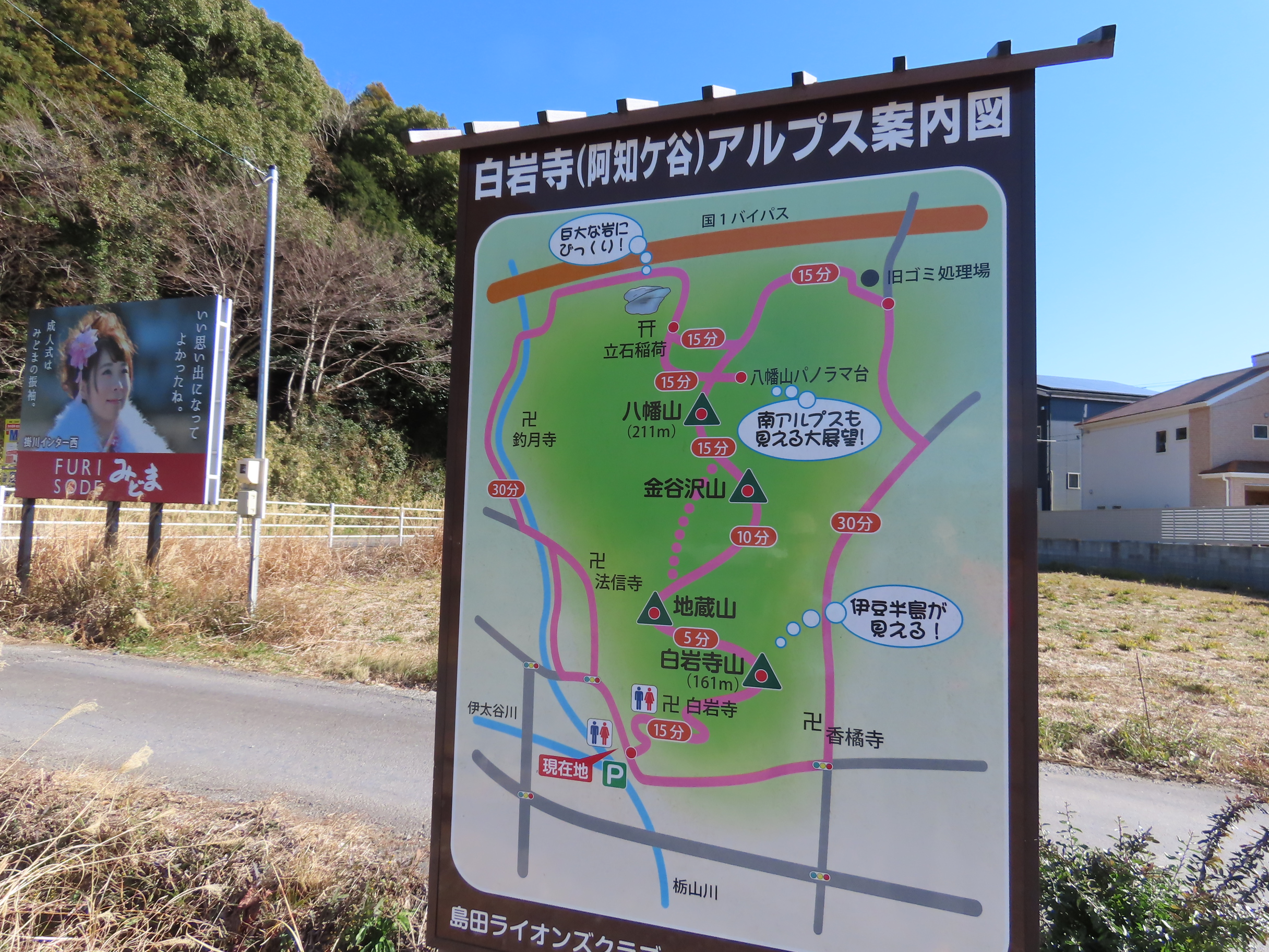 超低山でありながら、抜群の眺望の良さを誇る島田市の通称、阿知ケ谷(あちがや)アルプスヘサラと久し振りに、妻を伴ってでかけた。ここは、今回で3回目、前回と前々回は縦走し、北側の立石稲荷に下って一般道をテクテク歩きで周回したのだが、今回は、八幡山パノラマ台から往路を戻った。アップダウンの多い山なのでその方が体力作りには、なるだろうと考えたのだ。なお、通りを隔てて2ケ所ある専用駐車場は休日で好天気とあってほぼ満車状態~なんとか止められたが、。(なお、3回目と云うのにここへ来るまでに道迷いをした。本来は、国道一号バイパス野田ICを降りてしばらく南進、左の向こう角にスギ薬局のある信号交差点を左折すれば、良かったのだが)駐車場から白岩寺は5分足らず、今年の正月はいろいろあって初詣を図らずもここでした~南に面した明るい山道を10分も登れば広い白岩寺山(161m)山頂思い思いにくつろぐハイカーさんたち~ここまでだけでも来る価値充分牧之原台地には広大な茶畑、静岡空港、右に掛川市、東山の粟ケ岳、「茶」文字のランドマークはここからもよく見える!映画やTVのロケ地としても知られる大井川に架かる、世界最長の木造歩道橋「蓬莱橋」全長897.4mは「厄無し」としてここを渡れば縁起が良いとされているそうだ~昔から通行料が必要でかっては銭取り橋としてもその名を知られた橋だ~今は、大人100円、子供10円必要!昔、一度渡ったことがあるが、幅が2.4m。、欄干が低いので結構、高度感があって高所恐怖症の人には手強いかもしれない。強風時は帽子など飛ばされないように注意~そう云えば河原にいくつか落ちていたっけ~なお、この橋は、元々、牧之原台地開墾のために作られた橋でいまでも生活道、農道でもある~ズームアップした蓬莱橋、歩行者が点々と映っているのがみえている~眼下に大井川、島田、金谷の街並み~伊豆半島の西端、波勝崎の西側に伊豆七島の新島と、、神津島白岩寺山で充分景色を楽しんだその後は、けっこう歩きごたえのあるアップダウンの山道が続き、展望のない、地蔵山、金谷沢山を越えて八幡山の山頂を左に見送って、八幡山パノラマ台の最終目的地に到着早春のような明るく柔らかな陽射しが嬉しい!左手に焼津アルプス、駿河湾、遠く伊豆半島までも見通せる~八幡山パノラマ台からの富士山がデンと聳え、手前に安倍東山稜、丸子アルプスが立ち並ぶ~妻のミスショット!こんなにアップで撮られたとは思わなかったが、これもまたいい記念写真かな先月に登った菩提山~双子山高根山 竜爪山八幡山パノラマ台から戻ってきました~ポカポカ陽気の陽だまりハイク~所要時間2時間半足らずのミニハイクだったが、大変良い気分転換になったいい山だ~<参考コースタイム>阿知ケ谷アルプス駐車場11:10~11:15白岩寺~11:25白岩寺山11:30~11:35地蔵山~金谷沢山~12:05八幡山~12:10八幡山パノラマ台12:35(往復)~13:35阿知ケ谷アルプス駐車場歩数計→7950歩 2.5万図 向谷(むくや)