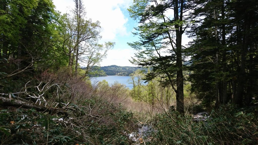 木々の間から尾瀬沼が見え始めてテンションアップ