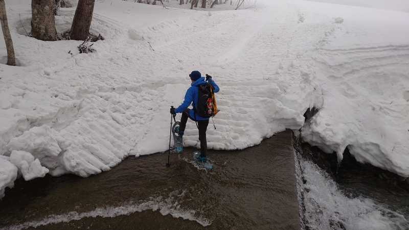 スノーシューで渡渉する人、初めてみたわい。浮力が違うらしい(笑)