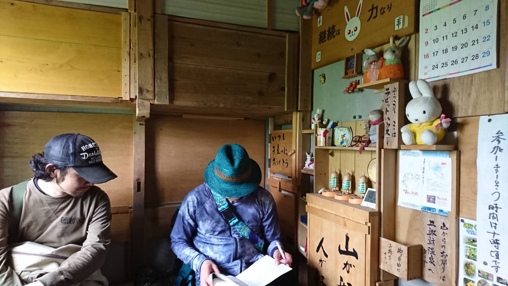 西峰頂上の近くにあるラピッドハウスにて、コージが思い出ノートに記入していた。
