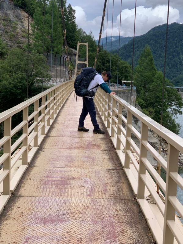 ここからは黒部湖のほとりをひたすら歩くのですが、やはりダム湖の周りは山崩れが激しいらしく道が荒れてかなり遠回りな道のりとなっていました。地図を見て想像したのとはぜんぜん違う難路。。。