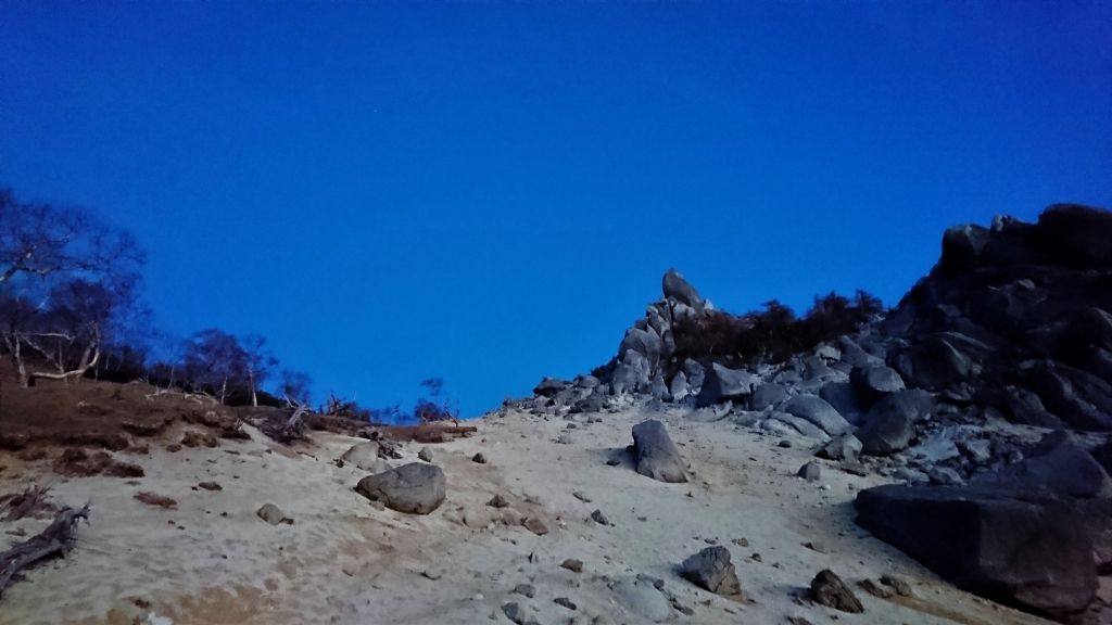 樹林帯を抜けたら砂地の急坂でした。グリップ出