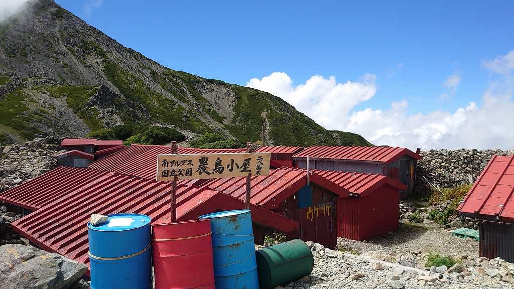 農鳥小屋と、その奥に立ちはだかる間ノ岳。