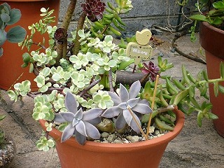 ブルーバード エケベリア属・ベンケイソウ科 葉は肉厚で白く、ほんわか紅葉。 本を購入したときに、きれ~いと 思ったのが このブルーバード 上から見た感じ 手に入れる事なんて、出来ないと思っていたけど・・・ おかげさまで、毎日眺めています 横から見た感じ、蓮の花の様に、綺麗 黒点病にやられちゃうのが、いやなので、弱そうな子は 少し部屋に、待機状態です。 ハウスは骨組みは、出来ましたが、ビニールがまだです 早く多肉達入れてあげたいです ☆ ヽ(○´∀`)