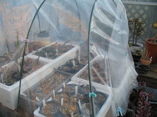 最近の寒さは本当に異常ですよね。 ハウスの中でも、凍ったりしたものがでました(ペペロミア系) チョット危ないぞ。 それで、私のコレクターのガガイモ君達に、 少しでも、環境の良い様に、ハウスの中に簡単ハウス設置です。 多少 寒さが緩和するといいのですが。 ココには、ガガイモとユーホルビアと置いてあります 見えなくて残念ですね。 日中は今日の最高気温が38度 (ハウス中全体) 暑いので、簡単ハウスは開けてあります。 この気温は、午前11時の気温です 多肉達の棚にも、温度計を、 朝はこの気温が-表示にもなる時があります。(こわ~) 天気予報を見て、気温の下がる日には、新聞紙を掛けます 結構大変なのです、是が・・・・ 日中は太陽燦々なので、ハオルシア・アロエ・アガベ・ガステリア に、寒冷砂してみました。 日に当たりすぎて、綺麗な緑が、変わってしまったので、 この方法で、どうかしら? 以前のハウスとまたレイアウトが、変わりました なずけて進化するハウス なんちゃって・・・