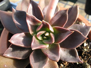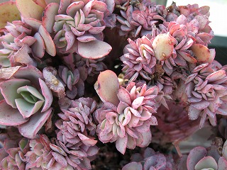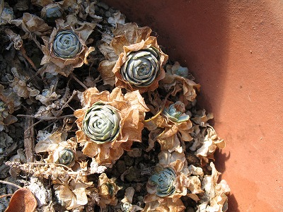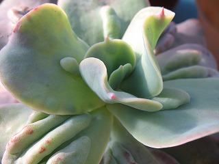 エケベリア 高砂の翁 (タカサゴノオキナ) フリルのある大きな広い葉を重ねる大型種 子株は出にくいので、ふやしたいときには、春に思い切って 株を下のほうで、切り取りさし芽する 上の写真は、まだ少し 紅葉前の物 今は、大きさ30センチ 高さ15センチはあるかな? ハウスの中の入り口に両方。 来る人を お出迎えo(^o^o)(o^o^)o こちらは、高砂の翁のセッカ種 セッカ種とは・・・・何らかの理由で茎の成長点の分裂に 異常が生じ、茎の先端が板状に分化し、扇状に広がった物 愛好家の間では、不思議な姿が珍重され、 綴化(てっか)帯化とも言われるそうです。 NHK 趣味の園芸ガーデニング21 (多肉植物より) 今日のつぶやき 肩が凝るので、ホッカイロを肩に貼りました。 頭も ぼ~っとしています ヤバ・ヤバこの時期、私が体調壊すわけにはいかない。 受験生が頑張っているのに・・・しっかりしなきゃ☆