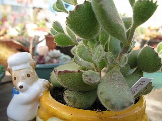 熊童子 (クマドウジ) 小熊の手を イメージさせる、産毛が生えたふっくらとした黄緑色の肉厚の葉が、特徴で、爪に見える赤みを帯びた葉先の突起が愛らしい。 夏は、成長が止まるので、水遣りを控えめに。 春に、葉挿しか、さし芽でふやす。 植え替えは、春から初夏に。 ごめんなさい。名札が、違っていますね。 子猫の爪になってますが、誤りです。(ペコリ) 秋から晩秋に釣鐘上状の薄いオレンジ色の花を咲かせます。 まだ、花芽は、付けてくれません(´ヘ`;)ハァ このカップ ケーキが入っていた入れ物 可愛かったので、使ってみました ★。、:*:。.:*:・'゜☆。.:*:・'゜★。、:*:。.:*:・'゜☆。.:*:・'゜★。、:*:。.:*:・'゜ こちらは、昨日載せた、高砂の翁 現在の様子です。 だいぶ紅葉しているでしょう(@^_^)ゞ 何もなく 平和な一日だった(*´▽`*)