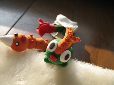 今日は、朝から雨でした。 今日は仕事を終えて、お腹がすいたので、 買い置きしてあった、某・焼きそば (お湯きりタイプ) を、つくりました。 お湯を入れて5分 じゃあブログにでも チェックをと思い 少しのはずが、はまり込み およそ15分も経っていました。 あっ!と思ったときには後の祭り。 今日の焼きそば量が多いな と、思ったのは、お湯の吸いすぎで・・・。 麺は太く柔らかくなっていて・・・・。はっきり言って、マズイ 最悪! けれど、お腹が空いていたので、やっぱり少しは、食べました。 (空腹には、勝てなかった) 数時間後。 学校から育ち盛りの長男が帰宅して (お腹すいた~。なんか 食べる物ない? あ!この焼きそば食べていい?) 美味しくないかも知れないけれど、どうぞ!! この位の子って(中一)美味しさよりも、まず空腹を充たしたいのかな。 あれ。 アタシも同じか・・。(あは。) その息子が、作った紙粘土の虫の作品です! 寄せ植えに、チョコット飾ろうと思って、作って貰いました この子ちいさい時から、粘土ずくりが大好きな子でした。 親が言うのもなんですが、机とか椅子なんかも作りましたよ。 ポケモン・デジモンのキャラクターなども得意でした こういうのを、クレイド-ルというそうです。(本人が言っていました)