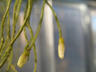 これは、なにに属するのかしら? 多肉・サボ・観葉 とってもお水が大好きな子 先っちょが、少し膨らみかけたな? と、思っていたら、蕾になっちゃいまして、お花が開きました。 吊るしてあって、お水かけも忘れてしまい、こんなに痩せています 珍しいと思うのですが、何者でしょう? ちなみに猿恋葦にも変化が・・。(これはサボです) これは、蕾・花どちらなのでしょうか? 不思議です