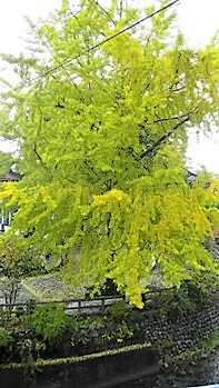 小さな川を渡ると道の下にお寺があり、境内の銀杏の大木が美しく色づいていました。