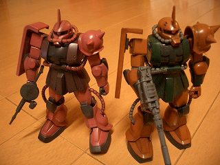 勉強しろと小うるさい母上もホームで酔い潰れてるお父さんもバイト先の頼りになる先輩も職場のいやな上司も隠れ家好きな、ちょいワルおやぢ(ふふふ)も小娘には負けないと息巻くアデージョ(ふふふ)も友達以上恋人未満、いまいち踏み切れない彼氏彼女もザクといえばコレを思い浮かべると思われまうす。「本日の、満場一致」あ、ダレソレ専用もコレに含むとしましょう。・・・・・・え?「ザクといえばこれだろ」・・・ですと?「本日のザクといえばコレだろ」・・・「本日のいやぁ、コレだろ」・・・「本日のいや、マテ」・・・嘘おっしゃい。どうも。愛玩動物モルIでございまうす。ちなみに、同じクラス、左斜め前の席、ちょっと気になるあの娘が思い描くザクは、コレあ、席の位置はお好みで。・・・というように、「ザク」と聞いてコレを思い出す方は少ないとおもわれまうすが、コレもザクなのでございまうすね。旧型ザク、旧ザクとか呼ばれまうす。「ふーん。だったらコレは、「新型ザク」だね☆」と、お思いかと思われまうす。そうでございまうすね。確かにそうでございまうすが「新型ザク」とは、あまり言いませぬし、聞きませぬ。ちうい。世間一般、みんなのザクこと「ザクII(つー)」に対しこちらは「ザクI(わん)」でございまうす。で、ご主人様が極秘開発ちうのガンプラ3機。3機すべてその「旧ザク」だったというのは前回お伝えした通りでございまうすが・・・「どうも。きうざくです。」なんで旧型ザク?かと申しまうすと画像左、青いMGのランバラル専用旧ザクコレは前から気になっていた様で、最近購入決意。で、リンクしていただいてる藤徳様が、ちと前に「旧キットの旧ザク」作ってらっしゃったのでございまうすが、ソレを「いいにゃ~」と見てたご主人様。ちょうど現在某東京某MXTVでの「ガンダム再放送」も重なりガンダムに挑む、旧型ザクと、それに乗るガデムおぢさんの無謀な姿にも、しびれたご様子。で、ランバザク買おうと思ったショップさんでたまたま「旧キット半額セール」やってたらしく、「コレはチャンス☆」と、MGランバザク、1/100旧ザク、1/144旧ザクと纏め買いしたようでございまうす。これね。1/144 旧ザク(80年代発売再生産) 【半額セール】1/100 旧ザク(80年代発売再生産) 【半額セール】というのが今回の「旧ザク3機同時開発計画始動☆」の経緯だったのでございまうすが・・・・・・あ、そうだ。いまどき「素組みの旧キット」など滅多に見られないと思いまうすので、塗装前画像貼付でございまうす。「本日の意外と貴重な、素顔の君」うーん。見事にグリーン一色でございまうすね。豪快一色成型。潔いといえば潔いのでございまうすが。で、これを塗り塗りするとこうなりまうす。あ、骨折した腕は接着治療済みでございまうす。侮るなかれ旧キット。意外と広い可動範囲、実は「首まで上下」しまうす(・w・ )ムム。そして1/100はアレまで可動!(ーwー;)マヂ?!旧キットといえば、この夏大量に再販されたのでございまうすが・・・・・・おかしいですよ・・・気づきまうした?無いのでございまうす。腕が伸び縮みするアレ。モノアイが動くアレ。さすが、何ともないアレ「旧キット1/100ゴッグ」コレ、出てまうすか?出てないですよね?・・・(ーwー;)にゃぜ?