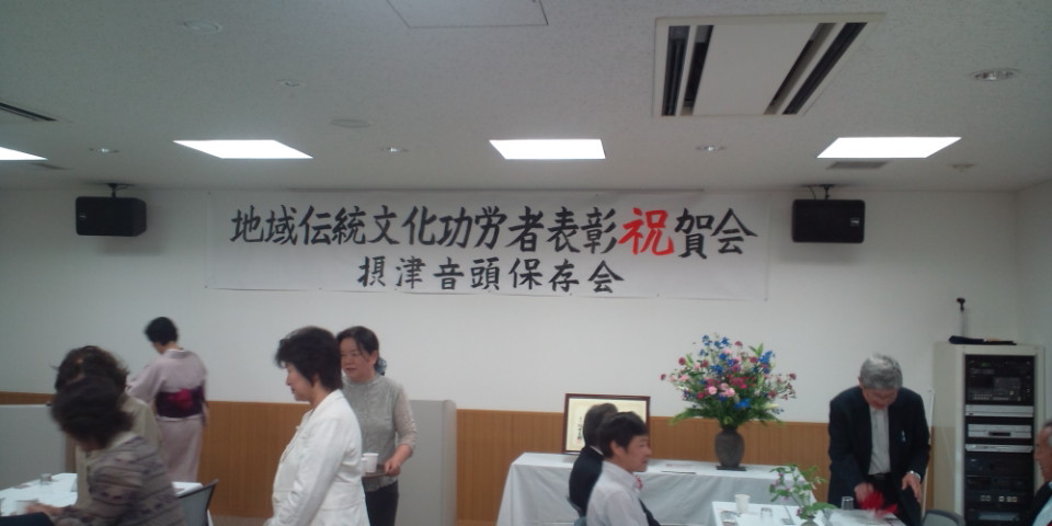 事の発端は、数週間前の盆太鼓の練習の時でした。うちの会の役員から「摂津音頭が文化財で表彰を受けてな。そのお祝いが5/20にあるんやけど空いてるか?」と。スケジュールを確認し「はい。空いてます」と答えると「そうか。じゃあ空けといてな」と言われました。内容はおろか時間や場所も聞いていなかったのです、とりあえず「空けとこうか(・_・;」とスケジュールだけブロックしてました。会長(親父)に聞いても「知らん。食事とか軽い飲みがあるんちゃうか?」程度。先週だったかの練習の日に再び親父に確認すると「昼間みたいやぞ」と。場所は伊丹市北野にある「きららホール」。実家から徒歩10分ぐらいでしょうか。その時に親父と話していた予想では、恐らく摂津音頭保存会や踊りの関係の方が集まって、多くて20~30名ぐらい?ちょっと高級な料理を食べて、会食して終了。アルコールも出るとは思うけどガッツリ飲むような雰囲気でもなさそう。そんな感じでした。開始時間を聞いたのは昨日でした(^^; 10:00開始だと。昨日はとにかくバテバテだったので「じゃあ実家まで車で行くわ。飲まんでも良いし」と9:00ぐらいに自宅を出る事にしました。自宅を出たところで会の方から電話が掛かりました。「開始時間、10:00やと思ったら11:00みたいやわ」と(汗)。でももう車で自宅を出てしまったので、実家で1時間ほど時間を潰してから歩いてきららホールに向かいました。到着して初めて分かりました。自分達が予想していたのとは全く様相が違う事を。。。会場手前には受付もあり、踊りの先生方などがいらっしゃいました。着物であったり正装であったり。男性は大体の方がスーツにネクタイ。ネクタイを締めて無い方も略式正装レベルの身だしなみ。私と親父はジーパンですよ!?(汗)そしたら一緒に参加している太鼓メンバー2人もポロシャツにジーパンという姿だったので救われました。・・・いや、救われてませんけど(苦笑)。うちの会4人だけがジーパンですから(-_-;参加者には、伊丹民謡協会のO野先生ご夫妻や各自治会長さん、議員さん、踊りの先生方、などなどそうそうたるメンバーで、ザッと数えて70~80名ほど。伊丹市長の藤原さんも見えました。こんな大掛かりな祝賀会と知っていればスーツで着たのに。前情報が少なすぎです!!(汗)はい。前置きはこんなもんで置いといて本題です(^^;摂津音頭保存会が受賞した事は、伊丹市のホームページにご紹介されています。平成23年度の賞に受賞し今年表彰伝達式を行ったそうです。摂津音頭は、親分格である「むぎわら音頭」と同様、伊丹市の二大民族芸能として受け継がれています。摂津音頭の歴史は大変古く、「チョイトカケタ」という名で知られていた摂津音頭の原形が唄い踊られていたのは、江戸時代後期まで遡るという事でした。昭和60年には伊丹市の無形民族文化財にも指定された、由緒正しい盆踊りなのです。9月中旬頃、伊丹市で開催される年のラストを締めくくる「摂津音頭保存会盆踊り」が荻野小学校で開催されている事も、盆踊りファンの方ならご存知でしょう。荒牧の天日神社の盆踊りなどと共に、摂津音頭を生唄で踊れる貴重な盆踊りです。我が盆踊り太鼓同好会は、摂津音頭保存会の太鼓担当グループとして、もう20年、30年とコラボさせて頂いています。摂津音頭保存会には数名の音頭取りさんとお囃子の方がいらっしゃいますが、今年、音頭取りをされていた福井勝さんがお亡くなりになられたそうです。毎年生唄で大変お世話になり、小さい頃から御馴染みの方でした。70代後半ではありましたが、去年までお元気に、普通に、摂津音頭を唄われていました。昨日その事を知らされたのですが、まだ全然ピンと来ません。。。あの渋い歌声をもう聴けないと思ったら寂しいです。福井勝さんのご冥福を心からお祈り致します。本当にお世話になりました。摂津音頭保存会の阪本会長は饒舌で、お上手なご挨拶でした。毎年盆踊り会長でも素晴らしいスピーチをご披露されていますし(笑)。式は、お偉いさん方のご祝辞・ご挨拶から始まり祝電の披露などがあり、1時間弱ほど過ぎた頃に乾杯・歓談でした。乾杯は伊丹民謡協会のO野会長。摂津音頭にまつわる昔話など、懐かしく興味深いお話を下さいました。この方も、私の父親と親交があるので、私も小さい頃から可愛がって頂いており、お会いすると気さくに声を掛けて下さいます。ちなみに料理はこんな感じでした。右下の空いたスペースは温かい天つゆを置く場所。これ以外に、お刺身と、饅頭のあんかけのようなもの(お菓子の饅頭ではなく、中華のような和食のようなあっさりした饅頭にあんかけしたような料理)がありました。私はとにかく場違いな服装に恐縮してしまい、ご来賓の方々にご挨拶しにいくのも恥ずかしく小さくなっていましたが、逆に自治会長さんが「今年も太鼓宜しくお願いします」とビールを注ぎに来て下さったり(車なので飲めませんでしたが)、恐縮しきり