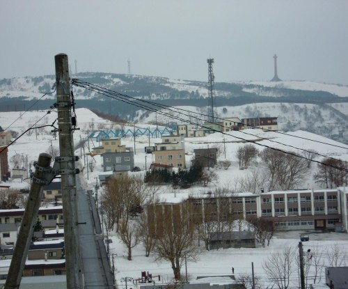 高みに上りたい。出世競争だけでなく最近お目見えした超高層電波塔に人がわんさ集る昨今。鳥なら自分の羽で空へ舞い上がり遠く広く俯瞰するのは可能。人間は飛べない分高い所から下界を見渡すのが心持ちが良い可能な限り高い所へ登ってみたい。そんな欲求が近年の高層建築や山ブームに転化されているという(出展:独断偏見に満ちたMy統計)。 そう考えれば宗谷地方は原野か田畑牧草地ちょっと盛り上がってるのは丘陵地帯で所謂"山"が見当たらない分"見渡す"には不利。岬ともなれば平面の極み。碑を見るには丁度よいが場所を見下ろす或いは見渡すのは結構な仕事になる。 最北の街へ行ったからには市街地を全景で見たい。その願望欲求を叶えるのが「こまどりの丘」である。南稚内駅から徒歩15分ほど。駅前の平らな道が丘に向かうと途端に斜度を増す。雪のシーズンは除雪さえロクにされていない事も多く駅近で遭難が簡単にできそうなシチュエーション。 100mが平坦道の3倍に思える急勾配を登り切ると稚内市街から向こうの丘や海。目線を少し下げると住宅が並んで普通の暮らしに溶け込んで、景勝地とはまた違う安らぎの風景が広がる。こまどりの丘から眺めると向こうの丘に開基百年記念塔が見えます。そこから右に眼を転じると稚内港方面の海が広がります。