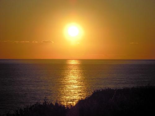 15:00チェックインタイムきっかりに投宿。廃墟臭漂う大ぶりで大雑把な建物は元々YHだったのを民宿にしたもの。広い玄関、ロビーの隅に立て掛けられたギター、YH時代にヘルパーをした男女の"ナウなヤング"だった頃の写真。元気一杯の「おかあさん」が出迎えてくれる。 バイクから荷物を降ろしていると男性が手伝ってくれる。てっきりおかあさんの息子?と思ったのだが4ヶ月近くヘルパー(居候)していると言う。便宜上ここでは「おにいさん」と呼ぶ。 おにいさんとひとしきりお喋りを楽しみ部屋で荷物の整理。楽しい時間は瞬く間に過ぎ明日は船に乗る。もっといたいな・・・口実を探すが見付かるはずもない。寝床を整えケータイやデジカメを充電し窓から徐々に暮れる空を眺める。「おーい」1階からおにいさんの声が。 「稀にない襟裳岬の夕陽だから見に行けば」。気付けば17:00チョイ過ぎ。おにいさんは自転車で行ってしまう。バイクを再度引っ張り出して岬へ急ぐ。 日中は青と緑が優勢だった岬は橙と藍に染まりつつあった。年間300日近く10m/s以上の風が吹く襟裳岬は風そよぎ波は穏やか。秋の透き通った空気が遠く遠く風景を広げる。安デジカメのファインダー越しには名画が展開され夢中に写真を撮る。 宿に戻ると「風呂沸いてるよ。早く入っちゃいな」とおかあさん。今日の宿泊客はバス・鉄道を乗り継いでくる青年でまだ岬から戻っていないようだ。「夕食は一人じゃつまんないよ。みんなで食べよう」黙々一人メシを覚悟してただけに嬉しい。 食卓に着く。青年・おかあさん・おにいさんを交えてジンギスカンやおにいさんが釣ってきた川魚の刺身、手作りの漬物、野菜の煮物など。小奇麗ではないがとても美味しい。話も弾む。おかあさんは九州出身だというので私の母が関西出身だと言えば「関西人には勝てないわ~」横からおにいさん「ババァ何言ってやがるっ」すかさずツッコミ。笑いが弾ける。気付けば23:00近い。 床に入り今回の旅を振り返ってみよう・・・その間もなくたちまち眠りに落ちる。明日も晴れの予報。♪しぼったばかりのぉ~♪思わず唄いたくなる落陽襟裳岬は日中とは全く異なる色合いに染まるバイクさんも撮ってみる