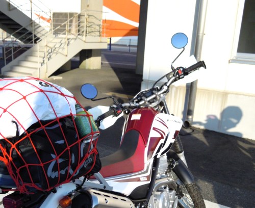18:30出港に向け大洗を目指す。約140kmの道のり且つ大半は高速道路は生来非力な250ccオフ車に楽勝とは言えないが北海道ではこの数倍を1日で走るのだ、キミの血液(エンジンオイル)はドロドロからサラサラになっている、できない訳ないではないか。 しっっっかし長ぇえ140km。初手から一般道の渋滞にハマりすり抜けで神経をすり減らし高速に乗ったら乗ったで走行車線で煽られる80km/h。道が不案内なのもより長さを強調して港に着いたらヘロヘロ。あ、休憩すんの忘れてた。 15:30過ぎの大洗港にはバイク3台くらい。乗船手続きを済ませブラブラ。休憩所でおじさんとお話したり缶コーヒーご馳走になったりで退屈はない。話しかけられ体質で良かったと一人旅に出るといつも思う。 17:00過ぎ、バイク乗船の指示が出る。一列に並んで待つ。その頃に着くライダーもいるが数はそう多くない。全部で10台くらいか。 湿った鉄板の上をソロリソロリ走って船内最下部の駐車スペースにバイクを停める。タイダウンできっちり固定されたのを確認して客室へ。荷物を置いたら風呂へ直行。一般客が乗る前に入る風呂はほぼ貸切で気持ちいい。ただし女湯だけの話ですが。 風呂から上がったらビールだビール。立て続けに2本空ける。レストランもオープンしたが緊張のせいか食欲がない。カップラーメン(210円)で簡単に済ませビールをもう1本飲んだらエライ満腹。 真夜中、眼が覚めて甲板に出ると月が水面を照らしている。陸地の灯りも時々見える。船はぶぅぅぅんと低いエンジン音を響かせながら北上を続ける。人影も疎らに見えるが誰の声もしない。船は低く呻り月が照らす海を進んでいく。大洗港に到着。ここから乗り込む。緊縛プレイ。こうしないとバイクが倒れる。ルプー氏が弾く「月光」を頭に思い浮かべながら。