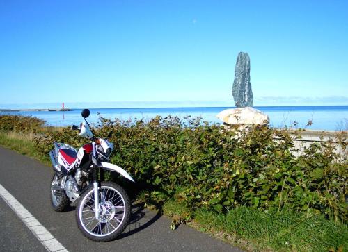 稚内YHなら眼ぇつぶっても行けるやろ。甘く見た私がバカだった。10数年の時を経て忘れてる。グルグル行ったり来たりし地図を確認。全然トンチンカンな方向へ進んでいる。軌道修正。 YHオーナーの息子さんが出迎えてくれ「お父さんはお母さんたちを迎えに行きました」。そう、今回は母+母友が飛行機で稚内を訪れ合流する変則スタイル。3泊4日の親孝行旅も兼ねている。老人たちは私のナビに素直に従うだろうか。 駐輪し専用おそうじウェスで拭き拭きしながらバイクさんの労をねぎらってると老人2人登場。「来とった~ん?」見りゃわかるでしょ来ましたよ。工具類や7日分の衣類や何やで重いギヤバッグと母たちの荷物を持って部屋に入り思い切り伸びをする。「疲れたやろ~」まぁね。でも楽しかったよ。 昼飯はYH前の急坂を下り切った所のセイコーマート(セイコマ)で買出し。のっけからセイコマオリジナルカップ麺でやや萎えるが実際バイクに乗ってると緊張もあるのか腹が余り空かない。ちなみにセイコマ・ホットシェフのおにぎりは大きくて温かくてウマイ。 翌朝。やっぱ6時チョイ過ぎに目覚める。窓から外を見れば快晴もいいところ。左を見る。利尻の頭が雲一つない。右を見る。遠くに見える島影・・・サハリン(樺太)である。 7時過ぎ"偵察"に出る。最北端の碑の向こうに見えるサハリンは稚内滞在日数トータル70日を越える私でも数回しかない。これからの全てが冥土の土産になる可能性が高い老人たちに感動してもらえる風景は拝めるか。確認せねば。 稚内市街から宗谷岬って近いでしょ?私もそう思ってました昔は。片道30km以上は都民にとっては県を跨いでおかしくない距離が市内。往復で1時間を見込んで最北端を目指す。 青い空の下に濃紺の海原が広がり波頭は白く光る。引き潮の海岸で大勢の人が何かを獲っている。後で訊いたところモズクが獲れるのだと言う。それもキロ数千円の高級品だとか。知らなかったわ~。 間宮林蔵渡樺出港の地は宗谷岬に比べると地味だが小さな船で未知の場所へ船出した間宮先生の勇気と帰還した御運にあやかろうと一旦停まって写真を撮る。宗谷岬は8時前だというのに駐車場に車が多い。果たしてサハリンは・・・これは大当たりだぜ。偵察写真?を収めYHに戻る。しかし母友が眠れなかったらしく調子悪そう。大丈夫なのか?この先?間宮林蔵渡樺出港の地。地味だが遠く広がる海原の先をめざした心にシミジミお約束の最北端の碑。碑の右側にサハリンの島影がチラリ宗谷丘陵から見たサハリン。丘には57基の風車が立ち並び電力をせっせ作るこの日はノシャップ岬から利尻がきれいに見えた