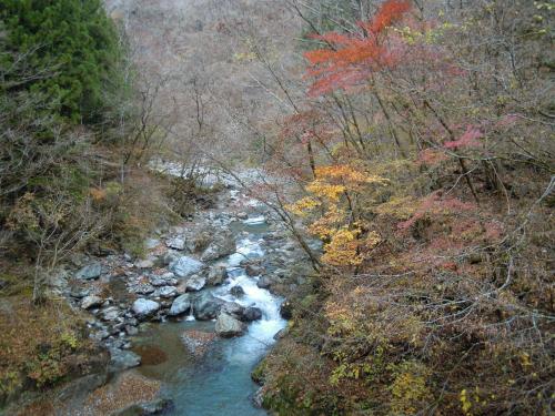 春の花見、秋の紅葉狩り、どれも興味のない無粋極まりない私。TVニュースのお天気中継で「軽井沢の○○池(←伏字ではなく失念)では見事な紅葉が・・・」などとキャスター満面の笑みの背後が紅や黄に彩られててもさほど食指は動かないわけで。 そんなワタクシめが師匠に偶々連れて行かれた栗原川林道。総延長約40kmの未舗装路とはいえ皇海(すかい)山の登山口もあり車で訪れる人も多い。平日は乗用車少な目・工事車両多めはありますが。 沼田ICを降り細くてグネグネした舗装路を上っていくと程なくダートになる。落ち葉が敷き詰められた道は下に石や泥が隠れていて油断禁物。標高が低い場所は緑優勢だが上るにつれ広葉樹が暖色に染まってくる。同時に道は片側が完全に垂直崖に変わり落ちたら間違いなく魂だけは高みを極められる。 右手は切り立った脆い岩盤が聳え立ち根を張る木々は自身の重さに耐えかねて斜めになって日除けを作り左手は奈落の崖から細身の木が空を目指して伸びる。道は細かく右へ左へ弧を描く。陽に透けた紅や黄が回廊を鮮やかに彩る。その向こうに広がるのは夏の緑に秋の色彩を吸い取って染め上げつつある峻峰の連なり。 メジャーでもなく探訪しやすいスポットではないが国有林ならではの人手が余り入っていないダイナミックな紅葉を走りながら愛でる。舗装化が進む今、それもあと何年の命運だろうか。沼田界隈にはリンゴ園がたくさんあった。向かって右側は急転直下の崖。きれいだからと見詰めながら走ると危険。勾配が強い山が染まりつつあった。