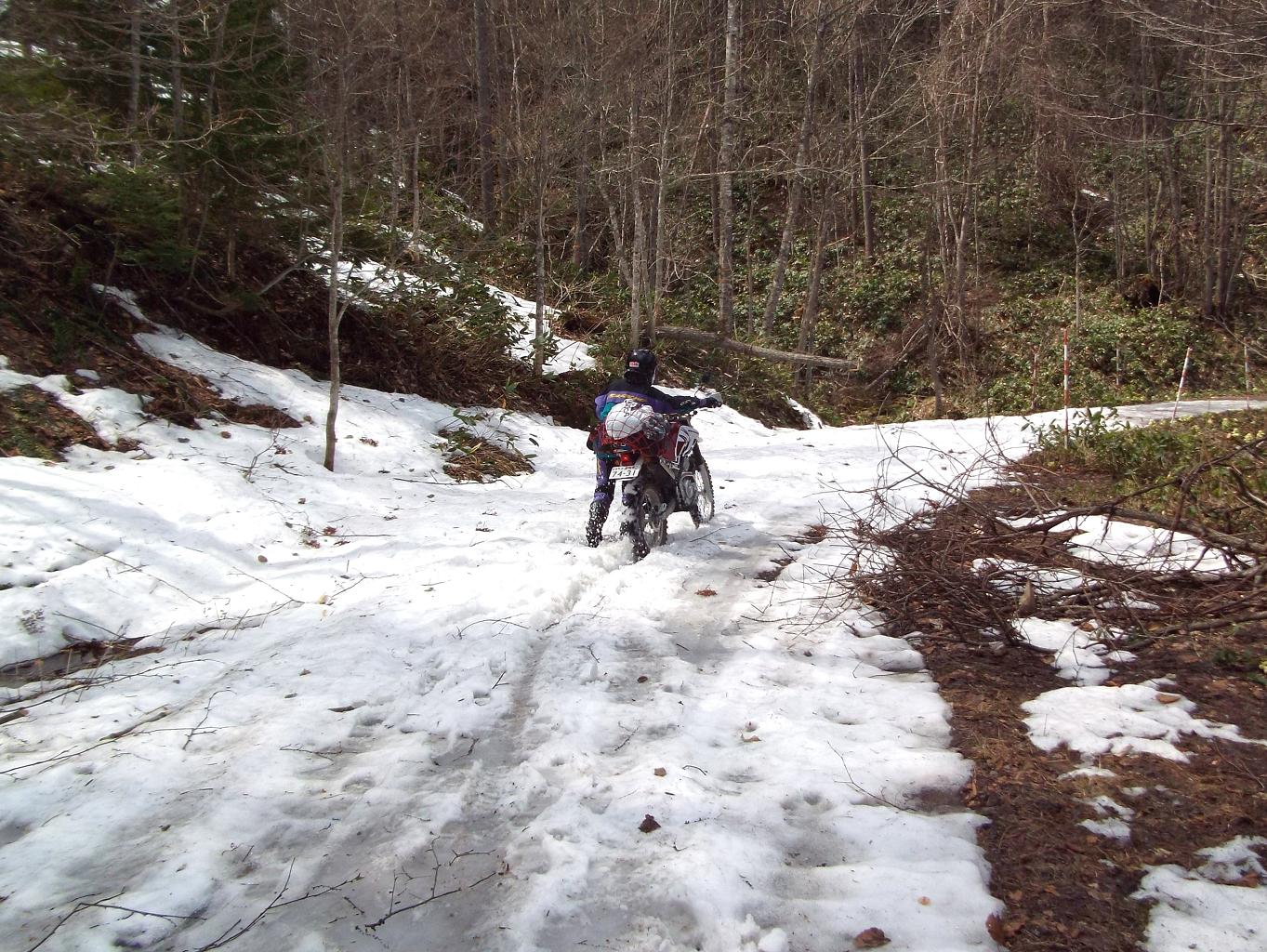 バイクにリターンしたはいいが、10数年振りともなると面白いほど乗り方を忘れていた。取り回しさえロクにできなくなってるのだから恐ろしい。 北海道ツーリング前、オフロード馬鹿師匠を拝み倒してセッセ通ったのがダート(未舗装路)。ダートを自転車でも良いから走ってみれば判るはず。舗装路と違い路面状況は砂利・土・抉れ・崩壊と刻々変化し不安定極まりなく真っ直ぐ走りたいがラインを選ぶうちにあらぬ方向へヨロヨロ、あげく転倒のリスクははるかに大きいという別に買わなくてもいい苦労を背負い込む。 しかし「走る・曲がる・止まる」だけでなく「操る」が効能として加わるので短期間で上達しないと明日をも知れぬ我が身としては効能が大きいのも事実。実際、面白れぇのよ。ヘルメットの中は「恐いぃぃ~~~」「うぎゃあぁああぁぁ~」「ああああアカンアカン~~死ぬるぅ~~」などと録音されてたらリベンジポ○ノも真っ青な赤っ恥だが。難しいと思われる何かを克服するのはヒリヒリするような興奮とマゾヒスティックな快感にビリビリする。 オフ馬鹿魂に火がついてしまったもののヒッソリ隠して大人しく(今、疑いましたね?)マスツーサークルの皆様とお付き合いしていた私。ツーリング先でニュッと藪へ向かう細道を見付けると思わず1人列から離脱したくなる心を抑えていたのである。 趣味の世界まで辛抱は利かず「ダートもいかがでしょう?」と呼びかけてみると。 意外にも反応があり喜んだのも束の間、「じゃ案内お願いします」至極真っ当な流れ。え?オラがリーダだか?今更ムリですとも言えず密かにリーダー修行を積む事に。 奥多摩にターゲットを絞り平日休みの師匠に教えを請うため仕事と有休をやり繰りしツーリングマップルを頼りに走っては写真やメモに記録、参加メンバーのマシンとダート経験値を独自の数式?に当てはめてルートを算出。いよいよ当日を待つばかり・・・ 「18日は関東でも雪になるでしょう」と天気予報。晴れてくれ気温よ上がれ祈り虚しく"第1回"はお流れ。善良な社会人である参加者を無事に帰すまでがリーダー。この判断は間違ってない。 「次回、楽しみにしてます」という声に応えるのもリーダーであるらしく、知恵熱出すほど苦労して選択したルートは白紙、未知なるダートを求めて走りに行くのであります。11月下旬は紅葉の名残が渓流を彩っている12月中旬。凍結にビビリながら走ると斜面が崩れて道が途切れる。さらに進むと・・・大規模崩落。千切れたガードレールとパラパラ小石を落とす法面が恐怖こんな倒木に阻まれる事も。どうにか越えたがその先で・・・