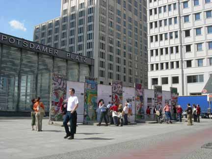 ベルリンの壁が解説プレートと共に行き交う人々に文化と歴史を話しかけています。