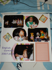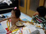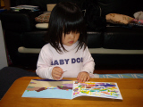 27日(水):宣言通り、ひたすらビデオ見て、まったりしました~。晩ごはん作るのさえ、めんどくさく(笑)なったので、旦那が帰ってきてから、オムライス作ってもらったり いただきま~す!!28日(木):今日も、まったり~。旦那がバイト先(スーパー)から持って帰ってきた、りんごのネットをかぶって、めっちゃ喜んでましたアホな姉妹!爆!!29日(金):今日は、初SB教室の日。しかも、初めて会う人やったんで、めっちゃ緊張でしたでも、 ばっちり仕上がったし、 喜んでもらえて、良かったです~1日(土):うさぎ組 最後の保育参観の日。 出る前に、こないだポチった<漢字パズル>と絵本が届いたんで、 ひっついて離れるの嫌やって、グズったから、「家帰ったら、アレしたいんやったら、ちゃんとしーやー」 って言うと、ちゃんと席に着いて、いつもの姿を見せてくれました1年前と比べると、ホントに成長したと思います! 何でも自分でできるようになったし、 今じゃ、電気さえ点ければ、自分でトイレをしてきてくれます強烈なイヤイヤ期は、まだまだ続くんやろーけど、 だんだん手がかからんくなってきただけマシなんかなぁ~。 その分、今 あいたんが第一期イヤイヤ期で、 気にくわん事があると、すぐひっくり返って暴れますもう、手がつけれんくて、疲れる。。。 今から、また同じイヤイヤ期が繰り返されるかと思うと、ちょっと凹みます帰ってから、早速 漢字パズル開けると、二人で、めちゃ食いついてました!! ここかなぁ~。じょうず~♪このパズルで、ま~たんのスゴイ事が判明しました!開封して、1回 絵の方をしたんやけど、次に「漢字の方もして~」と裏向けると、「そっち嫌!」って言うんで、「一回だけ!」と言うと。。。「反対見せてっ」と言うので、絵の方を見せると、「カニさんは、ココ!」「靴はココ!」と、漢字の上に絵の方を、どんどん置いていくで、完成~。しかも、全部、場所は合ってました。。。ま~たん、1回やっただけで、完璧に全部の場所を覚えていましたその、ものすごい記憶力に、めっちゃ怖くなった。。。パズルの40Pも、場所覚えてるから、すぐ出来上がるんやなぁ~って思いました。この記憶力、もっともっと伸ばしてあげたいです!!!