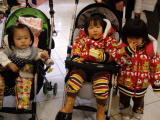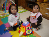 しばらく更新せん間に、掲示板とコメント欄がエライ事にホンマ、意味の分からん 書き込み、止めてほしいわそれでは、まとめて日記 いきま~す。18日(金):今日は、友達と天王寺へ~。ミオのBAQETでランチココ、サンマルクがやってるお店で、パン食べ放題やし、しかも めちゃめちゃ美味しかったですパン、おいち~!!ランチ後は、ブラブラ~。してると、なんか足がスースーすると思って見ると。。。ブーツが破れてきてましたバーゲンでいいの無かったし、2月いっぱい コレ履いたろーっと思ってたのに家まで帰れるかすら、危うかったんで、靴屋巡りして、なんと、8300円のブーツに出会いました!しかも、めちゃカワイイ~もう、即買いで、履いてたやつは、お店で処分してもらった友達から、あいたんの誕生日プレゼントに、コレ貰いましたずっと欲しくて(うちが。。。)、めっちゃ嬉しかったです!えいえいっ☆早速、二人で取り合い貸してよ!!19日(土):今日は、東京に行ったママ友が帰ってくるとゆーので、久々の4人で集まりました!ユカちゃんちで鍋パーティー9ヵ月にあったなんて思えん勢いで喋りまくり、食べまくりで、アッとゆー間に帰る時間でしたま~たん達も、揃うのが久しぶりで、喧嘩もしつつ、仲良く遊んでくれてたんで、かなりゆっくりできました。暗闇で絵本を読む子供達。。。初めて、チビ二人連れて、乗り換え3回もして、お出かけしたけど、意外と、ま~たんもおりこうさんで、楽ちんでしたこれからのお出かけの自信につながったかなぁ~20日(日):今日は、昼から平野のジャスコへあいたんの1歳記念の写真と、またまた 赤ちゃん写真展で行ってきました1歳記念の方は、ま~たんの時と同じく、 ぐるぐるどっか~んの衣装でちゃんと、新バージョンです!赤ちゃん写真展の方は、二人のツーショットで撮りました しかも、ウサギと牛のコスプレで(笑) 2/4(月)~10(日)まで、店で展示されてるので、 近くの方は見に行ってみてください~撮影後は、フードコートで昼ご飯食べて、あいたんが寝ちゃったんで、ま~たんと旦那はゲーセンに。。。つ、疲れた。。。Zzzディズニーの踊るゲームしてるけど、一切 踊らず、棒立ちでしたドキドキ…そして、恒例プリを撮りました~。 って言っても、12月は撮り忘れたし、 11月はTDRで撮ったから、機種古くて、 携帯に送れんかったんで、めっちゃ久々やったけど。。。