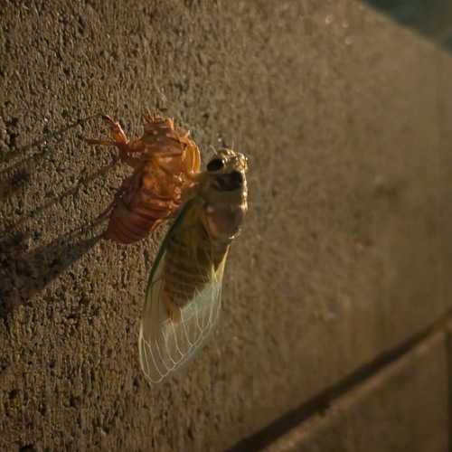 仕事から帰宅すると車庫の壁にセミの抜け殻?つまもうとしたらん?なんか目が黒いていうか背中割れてないもしかして今から出てくるやつ?1時間後こうなってましたきもいでも緑色のハネがきれいそれから30分後すっかり形になってるさらに30分だいぶ固まってきたかなーライトで照らしたら嫌そうだった