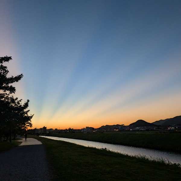 2025.7.28の夕方友人とお散歩した際薄明光線というのでしょうかとっても綺麗な放射状の光の空夏の日没前条件が重なると起きる現象いいものに遭遇して嬉しいお散歩時間でした✨