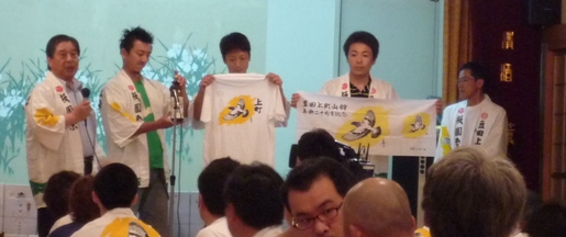 式典では法被の絵を描いた豆田出身の日本画家・岩澤先生をはじめとする4名に感謝状が贈られたあと、法被と同じ岩澤先生の描いた鳩の絵が描かれたTシャツと日本手ぬぐいと焼酎(ラベル)が披露されました。(写真)
