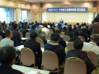 この会は来期のJ2降格が決まった上に、9億円の債務超過で、それを解消しない限りたとえJ2でJ1昇格圏内の3位以内に入っても昇格できないという悲惨な状況に陥っている大分トリニータを県民・行政・企業が三位一体で支援しようと言うことで設立されました。