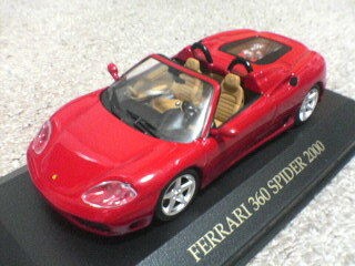 今日は久々にミニカーが届きました。今日のミニカーはFerrari 360 SPIDER 2000です。スパイダーは持ってなかったので、オークションでGETしちゃいました!1400円でした。私的に、スパイダーってお金持ちの車って感じです(フェラーリって時点でお金持ちですが…)庶民が一生懸命働いて、「一生に一度はフェラーリに乗るぞ!」ってなった時、一度しか買えないフェラーリってやっぱりスパイダーじゃなくて普通のルーフのフェラーリですよね?そーゆう意味でスパイダーってホントのお金持ちしか買わないんだろうなぁって思います。私も、全てを切り詰めてフェラーリを買う決意をしたとしたら、F355スパイダーじゃなくF355ベルリネッタかF355F1を買うでしょう!(夢ですよ夢。言うのはタダですから…)