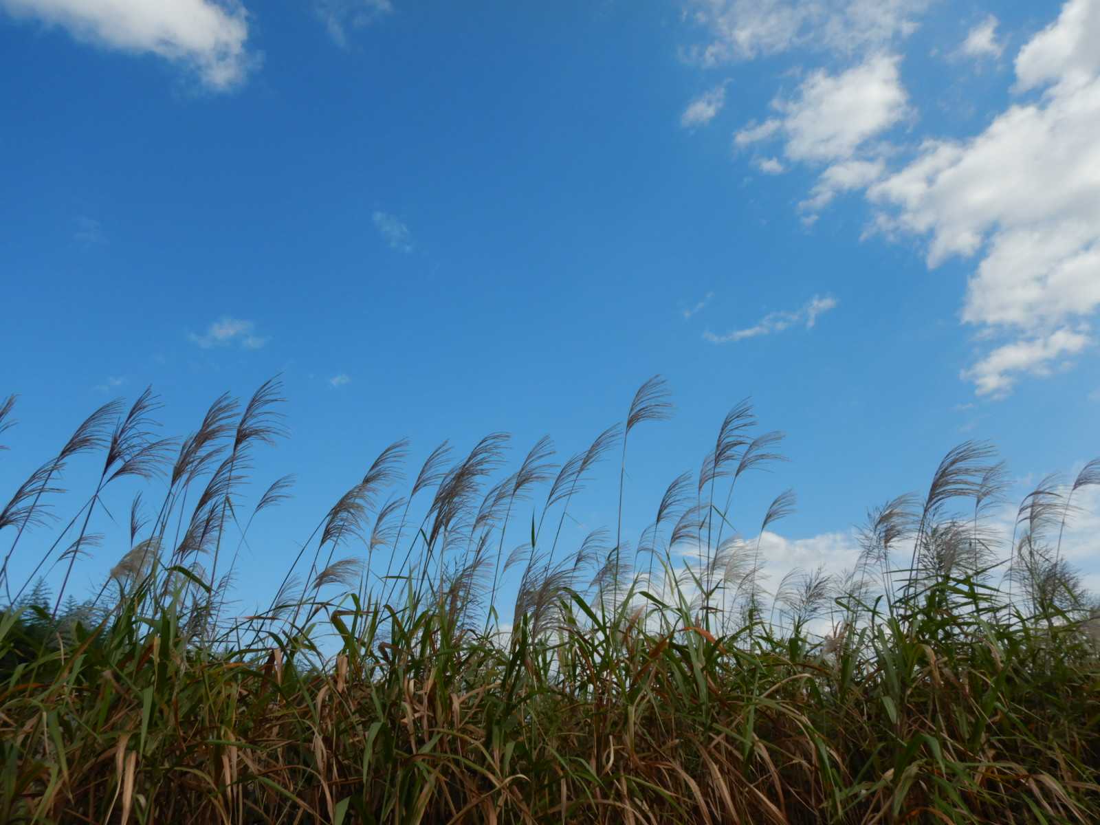 朝の空は秋らしい青空でした。昼近くになると雲が出てきましたが、山は見えています。水路にワスレナグサ(忘れな草)が咲いていました。ススキとサルスベリが同じ空の下に咲いています。台風の進路が気にかかります。