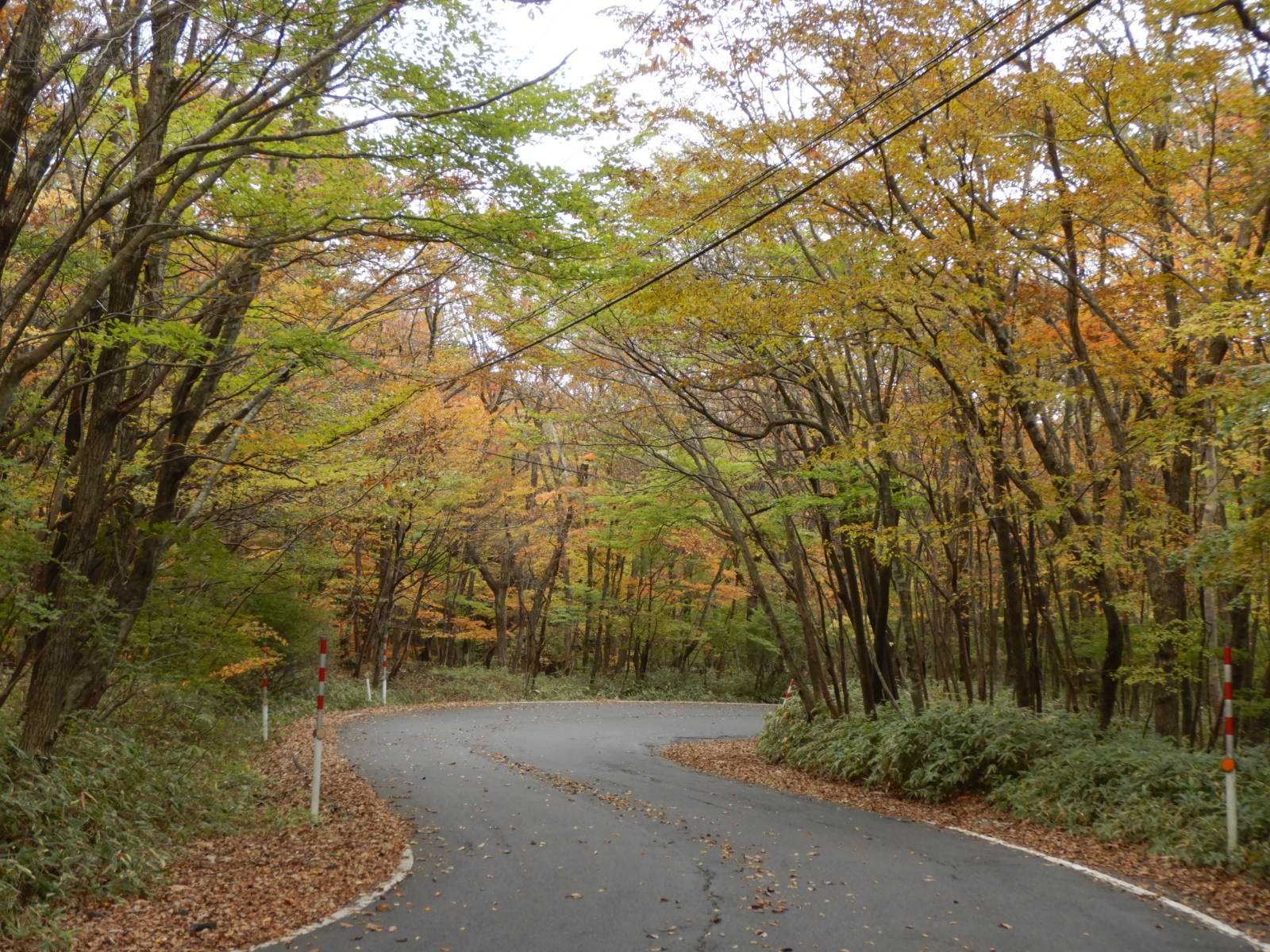 高原山の中腹を目指して車を走らせます。標高700mくらいから色づき始めていました。路肩の広い所を見つけて車を停めて写真を撮りました。薄日が差してきたりもしますがスッキリとしない天気です。標高900m~1000m付近、八方ヶ原と呼ばれる一帯です。気温11℃、日差しがあるともっと映えるんですがね。スッカン沢の谷が開けました。スッカン沢のハイキングコースは崩落で去年から通行止め、駐車場には工事車両だけが止まっていました。