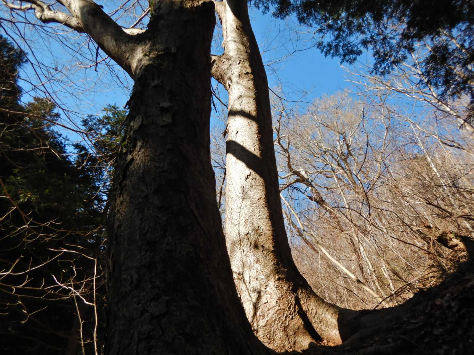 9時半に持方の駐車場を出発しました。気温は低いのですが無風快晴です。持方から男体山へ登る3本ある登山道の一番北の道を登ります。杉やヒノキの植林を抜けて広葉樹に変わる所、私が勝手に名付けた二本ケヤキです。30分ほどで男体山~袋田の滝の縦走路にでました。所々に現れる角礫変成岩という露岩にはステップが作られています。山頂の男体山神社、10時を過ぎていたので富士山は肉眼で何とか見える程度でしたが、近くの山は全部見えました。土曜日ですが珍しく山頂には4人しかいませんでした。風も無いので暖かく、登山者ともほとんど会わないのはありがたい。持方まで下り次は白木山、この地域では男体山が一番高く二番目が白木山、二つの山を八の字に回ります。檜の林を過ぎると山頂まで真っ直ぐに伸びたロープが現れます。岩の急登は200mか300mはあるかもしれません。樹林に覆われた山頂からは、わずかに男体山が見える程度でした。12時を過ぎていよいよ気温もあがってきて尾根道歩きには最高です。車道に出て持方集落に下って行くと菜の花が咲いていました。持方は標高500mの山里です。ミツマタはまだ蕾でした。今日もいい山歩きでした。桜が咲く頃まで低山歩きは続きます。