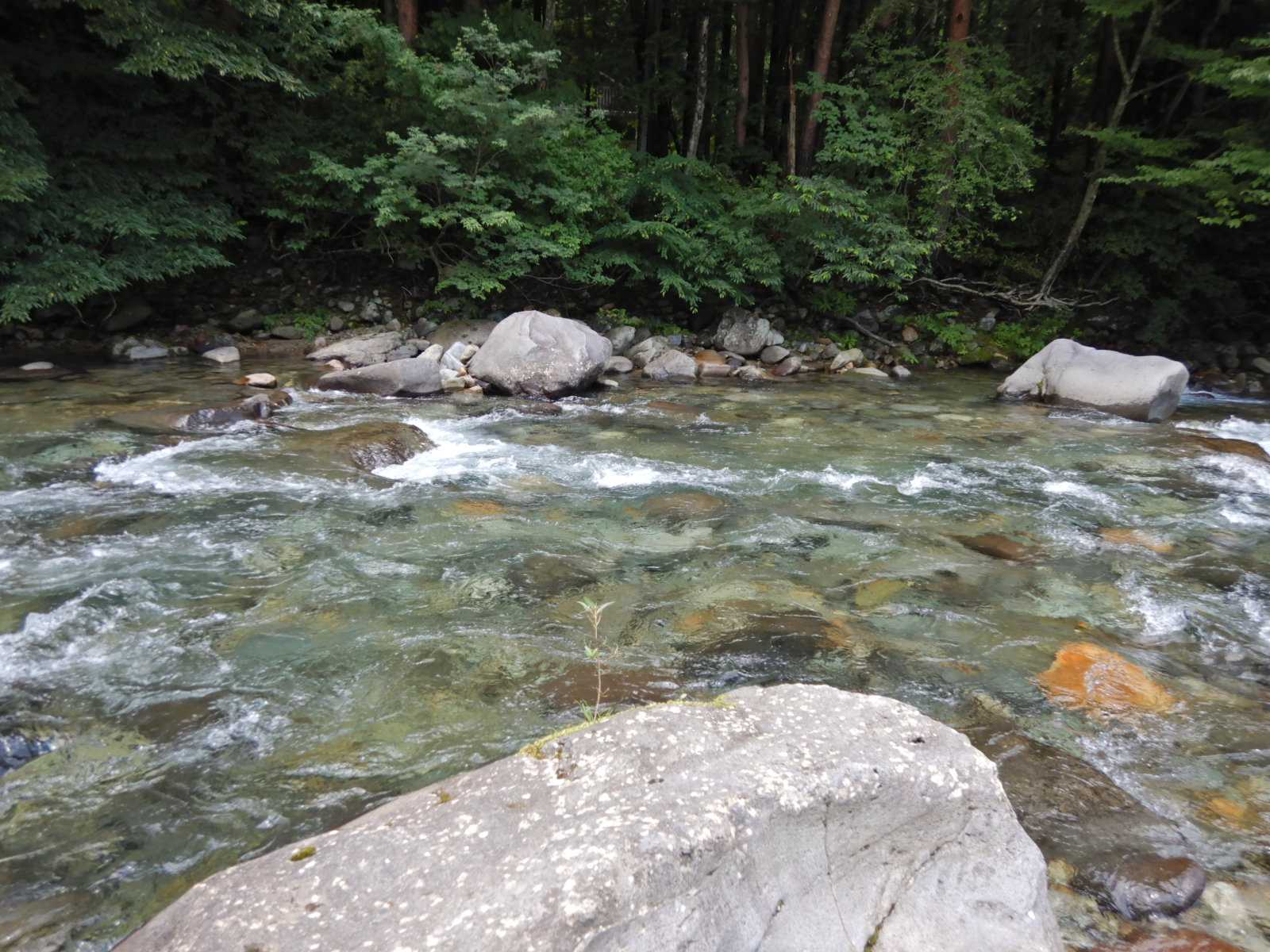 昨日、九州に大雨特別警報が出ている頃、栃木北部は晴れていました。午後から天気は下り坂となり大雨注意報が出て、4時から5時の間に53ミリの強い雨が降りました。今日も蒸し暑く晴れています。近所の川は少しだけ増水していました。昨日の雨は平地にだけ降って、水源の山にはあまり降らなかったようです。濁りはほとんどありません。ホウセンカ(鳳仙花)、ミヤコワスレ、晴れてもアジサイは生き生きとしています。葉の裏にカタツムリを見つけました。コンクリートの壁で休んでいるのはオニヤンマでしょうか?、人も虫たちも、雨が降って時々休むのは必要だと思いました。