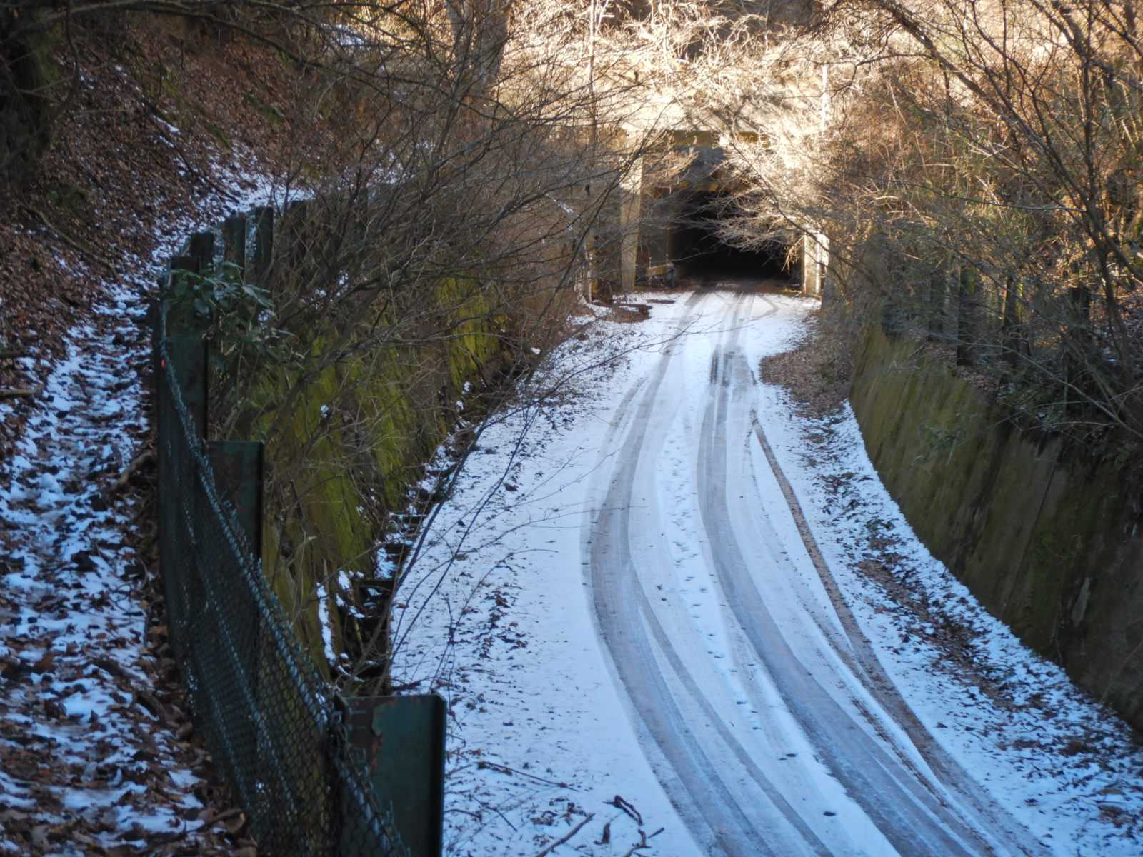 旧月居トンネルの所から奥久慈男体山へ向かいました。いつ降ったのか北向きの雪は溶けません。尾根道に雪は無くて30分ほどで鍋転山(なべころがし山)に着きました。遠くに筑波山は見えましたが奥久慈の山また山、久慈川沿いの展望が開けます。鍋転山から20分ほどで第二展望台に着きました。最初の水分補給をしていると、トレランと思われる人が追い越していきました。先に進むにつれて北斜面に雪が残る道が増えてきて凍みていました。奥久慈男体山が少しだけ近くなってきたような気がしました。幹回りが5~6メートルはありそうな大ケヤキ、何年か前に男体山から袋田まで縦走したことがありますが、その時は完全に見落としていました。逆にコースを歩くと全く違った景色です。その少し先は完全に氷結していました。ここに来るまでも、凍っている所は慎重に歩いてきました。10メートルそこそこの距離ですが手掛かりもありません。アイゼンか簡易スパイクを持ってこなかったことを後悔しました。12月の安達太良山で吹雪かれたこと、ゴールデンウイークの荒海山でアイゼンはあってもロープが無くて雪の壁を登れなかったことなど、昔のことが頭をよぎりました。少しだけ迷いましたが「また来ればいい」という答えを出しました。白木山と男体山の分岐まではもう少しの所でしたが引き返すことにしました。袋田方面に戻る途中、道を塞ぐような倒木の丸太の上で休憩しました。袋田から男体山に続く山域でもこの辺りは特に登山者の少ない所で、好天の日曜日でもほとんど人が通りません。立春は過ぎてもまだまだ冬で、日差しはあっても少しでも風が吹くと寒さを感じました。男体山には登れなかったのですが、帰り道に月居山(つきおれさん)に登りました。吉田類さんの「日本百低山」で紅葉時期の袋田の滝と山を紹介されたのですが今は冬、午後2時過ぎとあって誰もいませんでした。天気次第ですが、あと2ヶ月は低山歩きを楽しみたいと思っています。