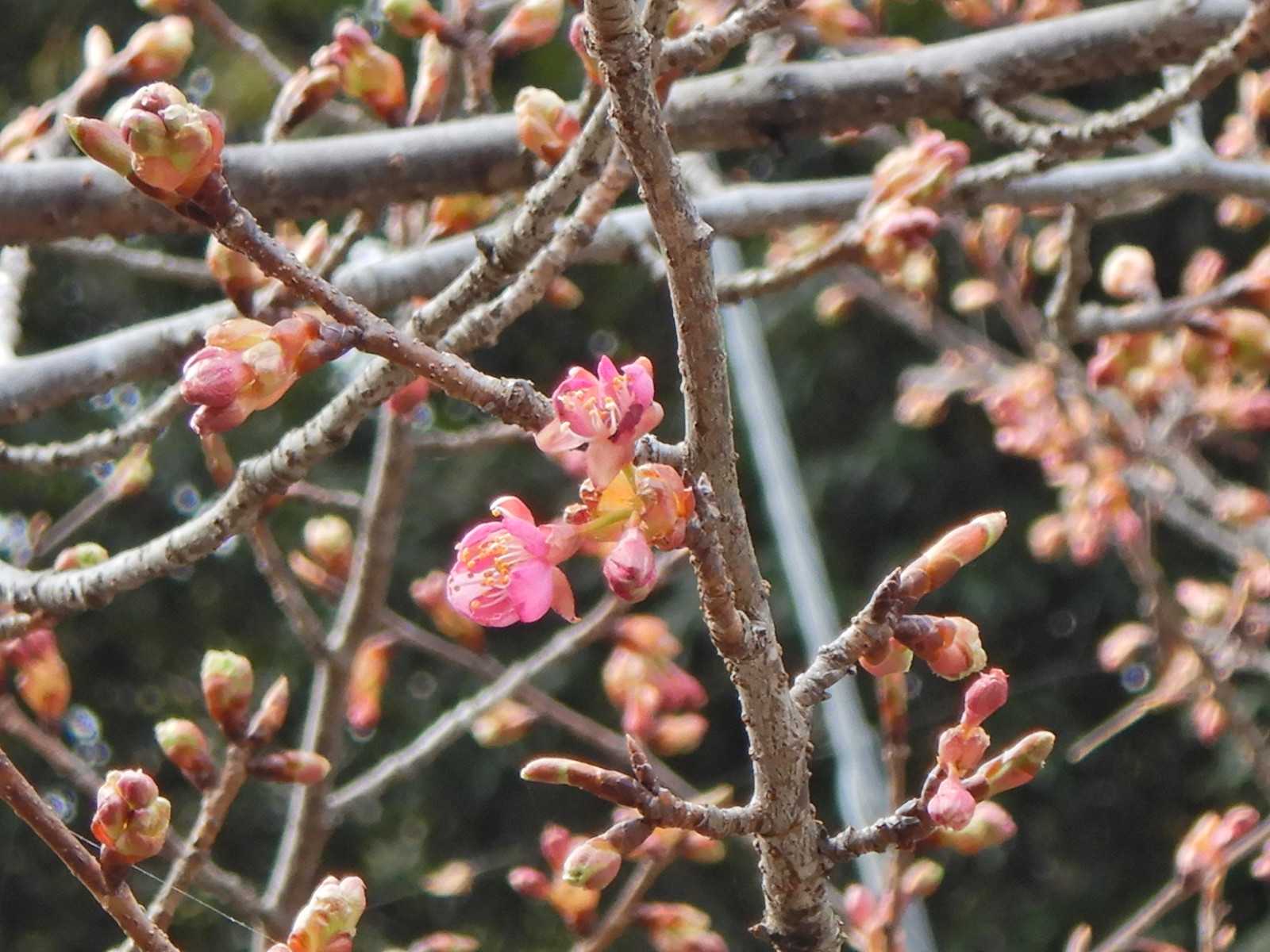 栃木県北東部の当地、ここ数日暖かいので神社の河津桜の様子を見に行ってきました。神社に20本ほどある河津桜の中でも一番早く咲く、三ノ鳥居横の木です。咲きかけのようですが、花びらが開いているものはありませんでした。沈丁花、福寿草、クレソンの中をカモが泳いでいました。13℃、14℃の日はあっても水路の水はまだ冷たいでしょう。明日から冬に逆戻りの予報ですが気になるのは金曜日の雪、1月25日は10㎝ほど積雪があり雪かきをしました。今回はどのくらい積もるのか今から気掛かりです。